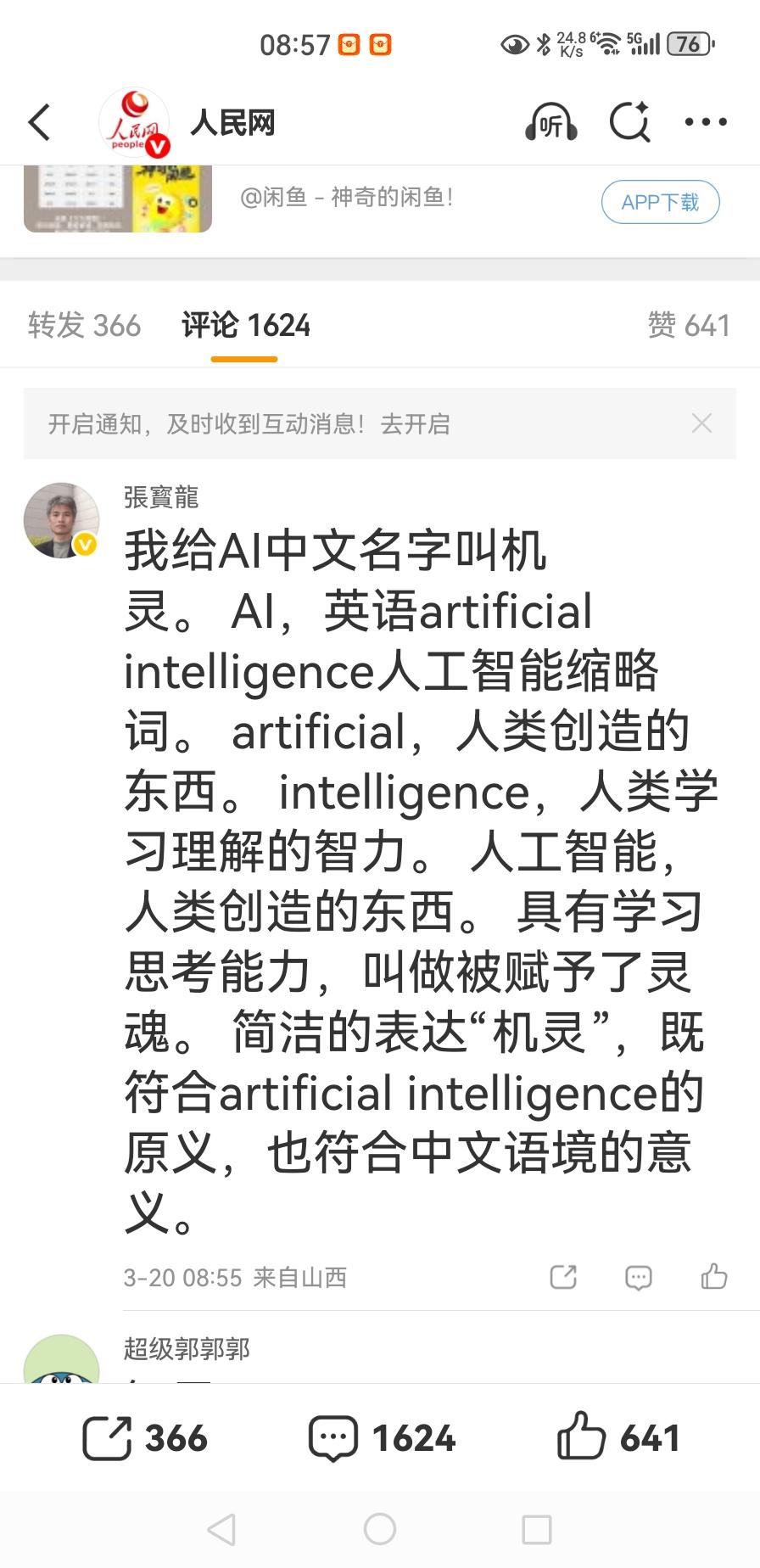 我给出AI中文名叫机灵。 AI,英语artificial intelligence人工智能缩略词。 artificial,人类创造的东西。 intelligence,人类学习理解的智力。 人工智能,人类创造的东西。 具有学习思考能力,叫做被赋予了灵魂。 简洁的表达“机灵”,既符合artificial intelligence的原义,也符合中文语境的意义。