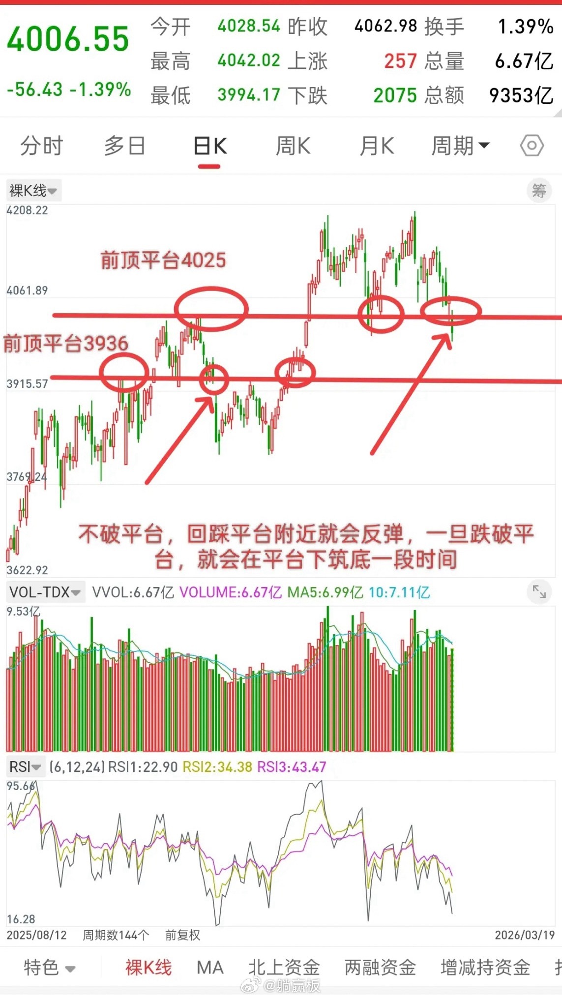 观点和昨晚一致,大盘目前已经跌破前顶平台4025,那前顶平台以上都是套牢盘,前顶不破,行情回踩前顶附近就会反弹,前顶破了,行情就会在前顶下方筑底。