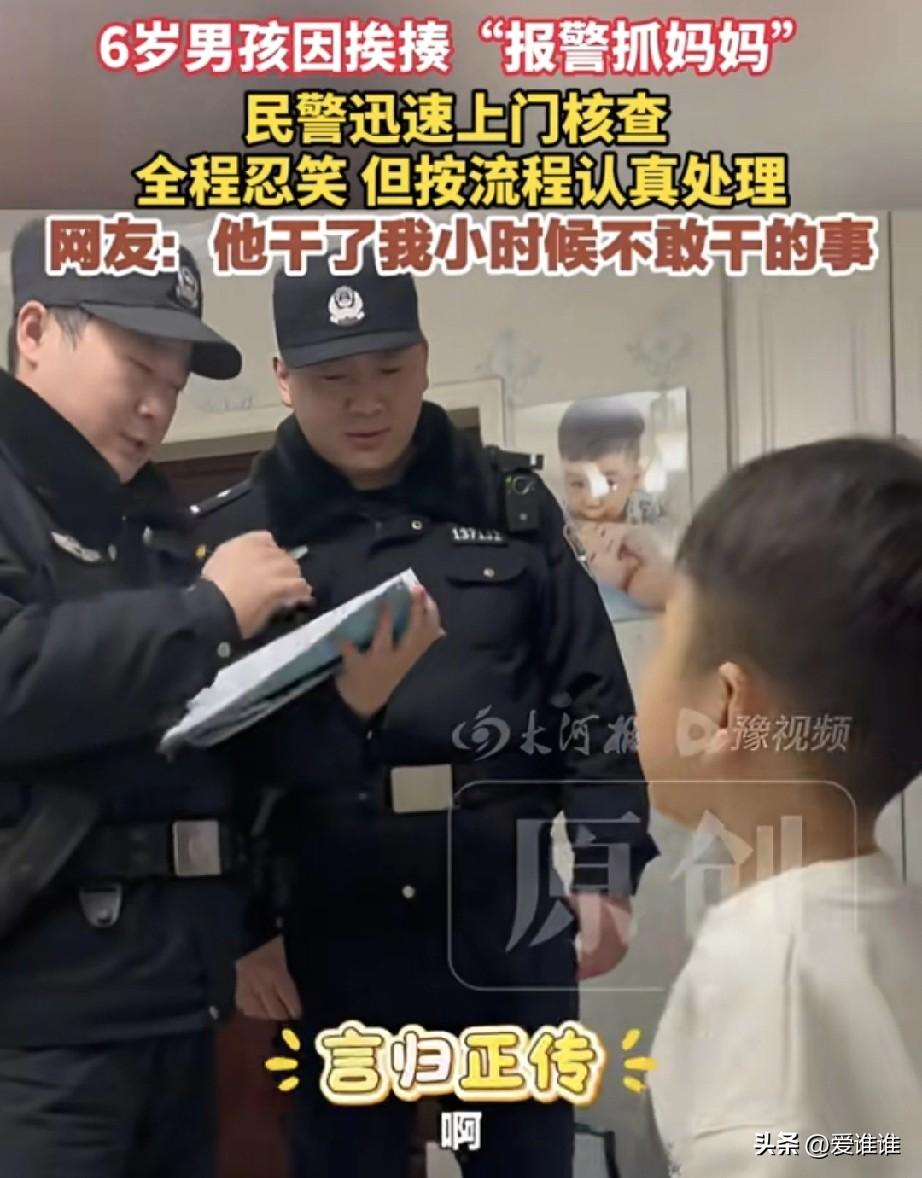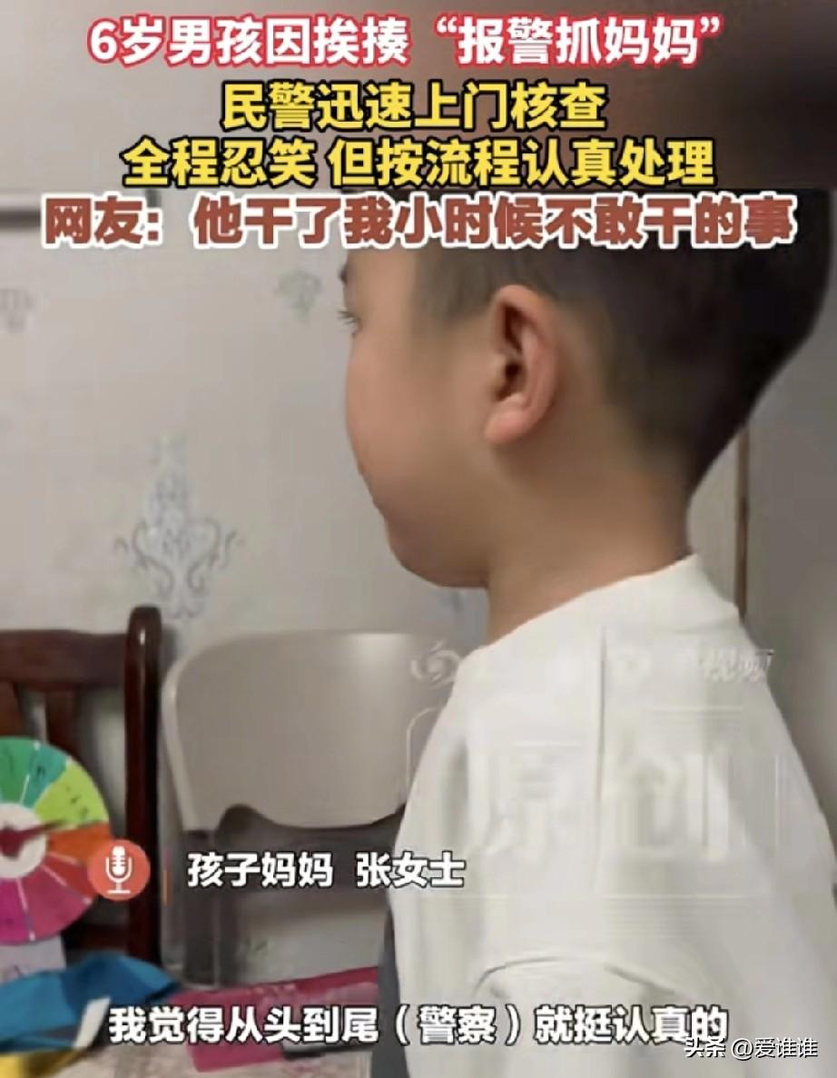 “这届孩子真难带!”6岁男孩因不好好做作业,被妈妈一顿胖揍,孩子挨打后偷偷拿起妈妈的手机报了警,警察赶到他家后,孩子妈妈很惊诧:“这点小事还麻烦你们,是不是浪费警力了?”民警的回答很暖心:“孩子的事没有小事,我们当然得来,”网友都对小男孩称赞:“你干了我们小时候不敢干的事!” 河南焦作,3月18号,刚上小学的6岁男孩想下楼骑车玩,妈妈觉得不如先在家把作业写了,后来孩子虽然也下去玩了一会,可回家后因为到底该不该先写作业这事,跟大人闹起了别扭,又哭又犟,说他妈妈对他不好,当妈的一时着急上火,就动手“教育”了孩子几下。 孩子挨了揍,一肚子委屈,当场就放出狠话,说要报警把妈妈抓走,妈妈当时没往心里去,以为孩子就是嘴上说说,哪知道这孩子趁着自己不注意,抓起手机就把自己反锁在屋里,真拨通了110。 妈妈站在门外,听着孩子在屋里清清楚楚地报自己名字、报家庭住址,心里头真是又好气又好笑,觉得平时教他的那些安全意识,这回可好,第一个就“报复”到自己头上了。 没一会,警察真的来了,而且一来就是四个,民警上门一核查,发现没啥危险,就是个赌气哭鼻子的小孩,旁边站着个满脸不好意思的妈。 妈妈说能看出来那几个民警同志其实挺想笑的,但人家工作态度特别认真,一点没含糊,民警蹲下来安抚孩子的情绪,还特别认真地说了一句话,让这位妈妈印象很深,民警说,这孩子是真把报警这事当个正经事来办的。 后来让孩子在出警记录上签字,这小家伙写得比平时写作业还工整,张女士也担心这样算不算浪费警力,民警的答复很明确:只要是孩子报警,哪怕听着不靠谱,也必须上门核实,这是职责,因为孩子判断力有限,万一真有事呢?同时也肯定了孩子遇事找警察的意识是好的,只是以后得教他分清楚什么情况才能打这个电话。 民警走了以后,这孩子自己关着门在屋里安静了大概十分钟,然后出来,跟没事人一样,对他妈说了一句:“我饿了,给我弄点饭吃呗。”吃完饭,他也乖乖把作业给写了。 这段视频发布后网友们瞬间“炸了锅”,有网友实名羡慕这份勇气:“这小子,干了我小时候只敢想不敢干的大事! ” 有网友对孩子的安全意识给予了高度评价:“地址报得这么清楚,绝对是有备而来,说不准早在心里模拟好多遍了。” 还有网友模仿民警的内心戏:“民警:从警多年,第一次处理‘家暴’报案,施暴者是个妈妈,受害者是个想骑车的娃,关键是立案都立不了。 ” 更多的网友则对母亲张女士的遭遇表示“同情”:“安全教育做得太好了,好到差点把自己送进去,这就是传说中的‘教育闭环’吧。” 我觉得这件事对于孩子来说,让他明白了:警察叔叔会认真对待每一个人的求助,但也让他知道了,有些“家庭内部矛盾”,终究还是要在饭桌前和解。 毕竟,没有什么委屈是一顿饭解决不了的,如果有,那就是妈妈做的饭!