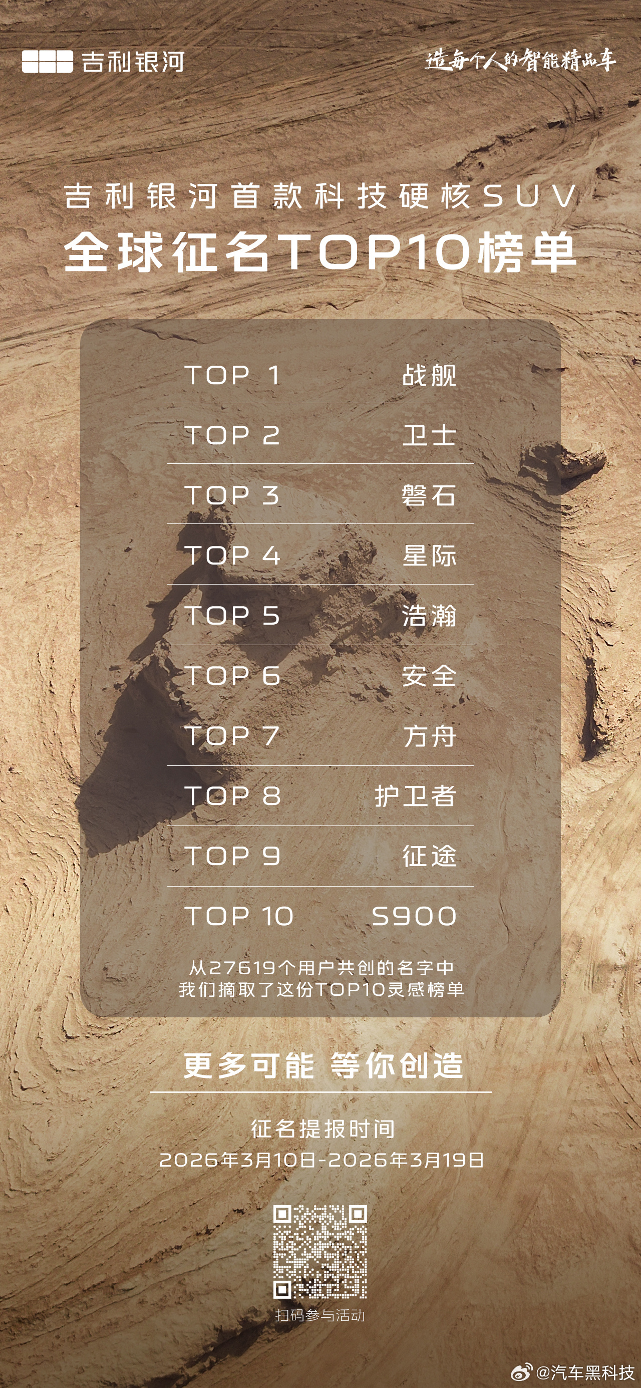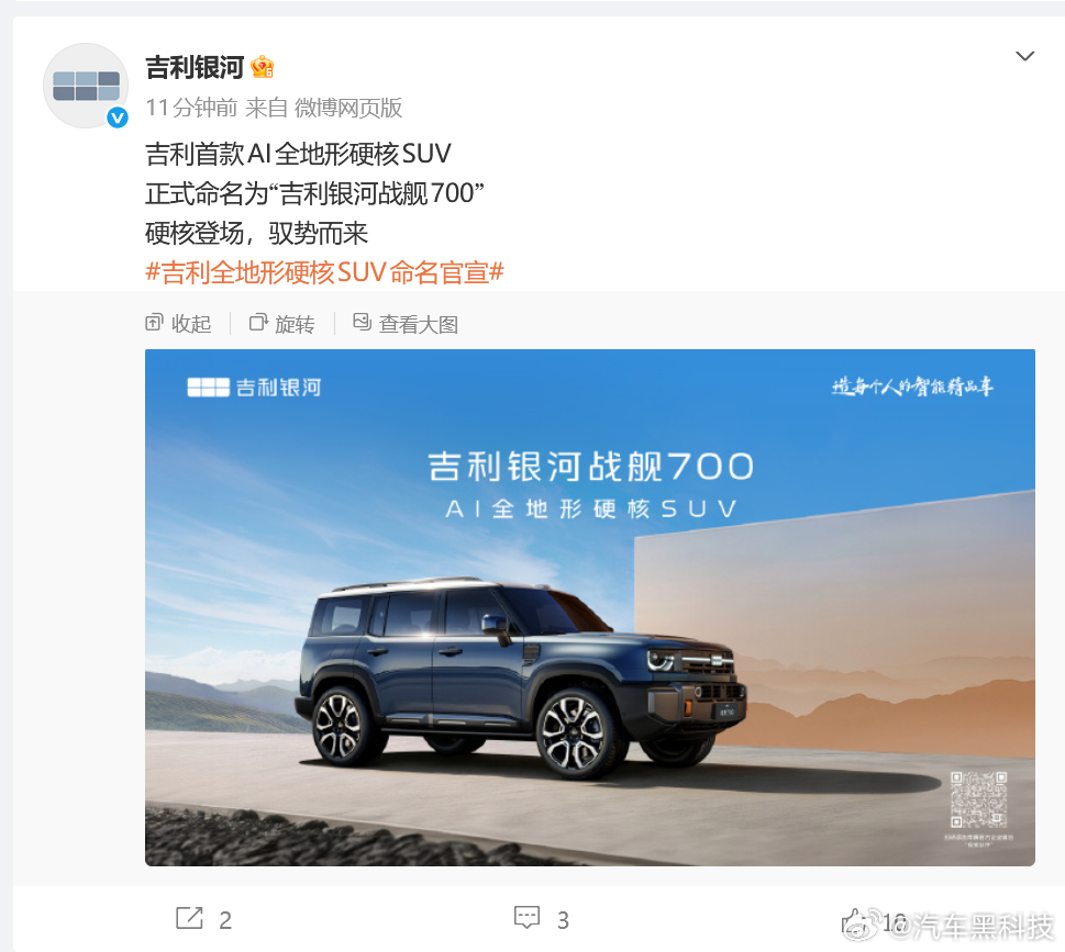 吉利硬核SUV命名为吉利银河战舰700 吉利硬派SUV来了,命名为吉利银河战舰700。采用了网友征名中投票最多的名字。