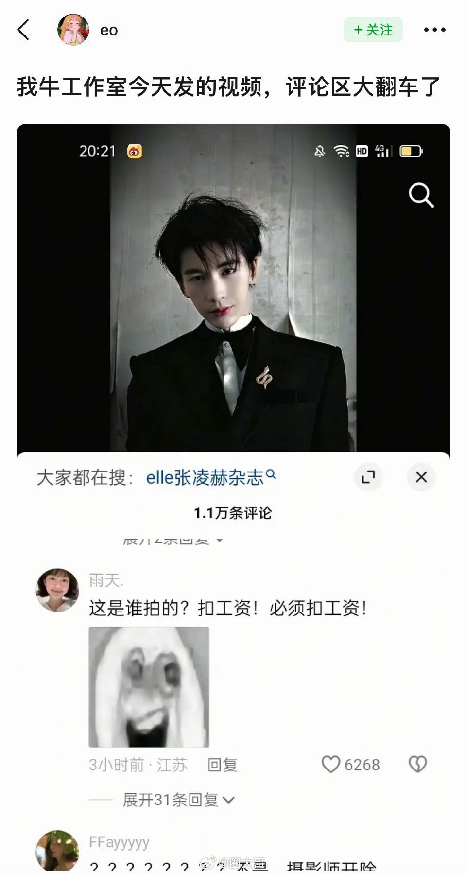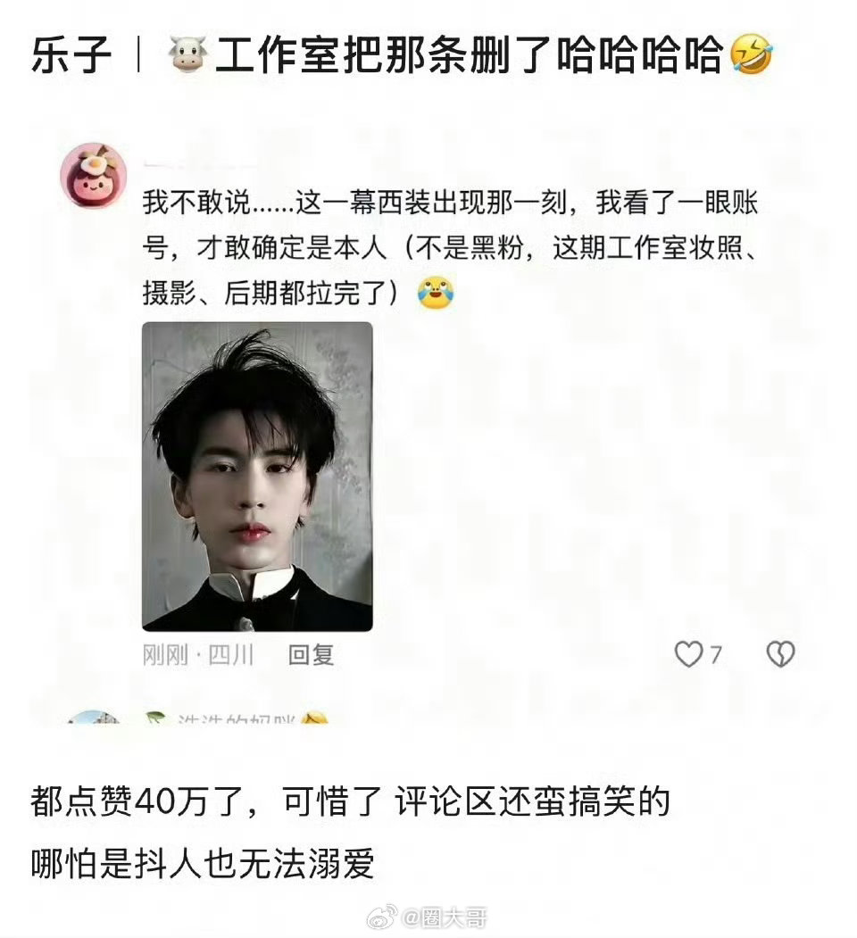 工作室删除张凌赫营业视频张凌赫的营业视频被工作室删了啊,这条视频的点赞都破40w了。就是说新晋顶流也不好当啊,连粉丝也差点没认出来这是张凌赫,看样子这次牛牛要给工作室减鸡腿了,工作人员还是长点心吧!张凌赫工作室删视频