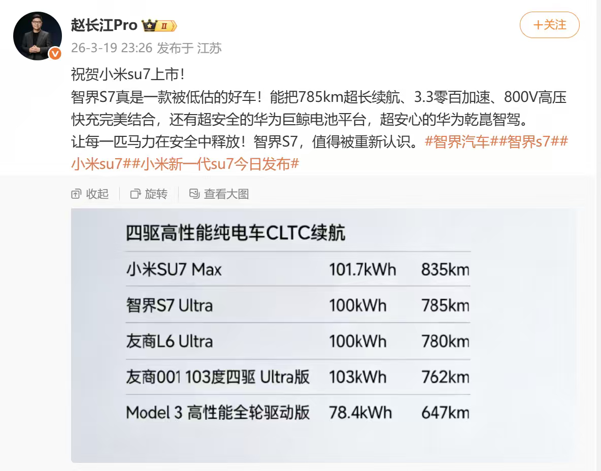 祝贺小米发布会圆满成功!汽车行业迎来更多伙伴,共同推动新能源与智能化进程,这是消费者的福音。赵长江总说得对,真正的强者从不畏惧比较,反而欢迎大家在对比中更清晰地认识每款好车。比如智界S7,一款被市场“低估”的实力派。它很好地将 785km超长续航、3.3秒零百加速与800V高压快充完美结合,不仅跑得快、充得快,更有 “华为巨鲸电池平台”与“华为乾崑智驾” 的双重加持,让每一匹强劲马力都在极致安全中释放。好产品经得起推敲,智界S7,值得被更多人重新看见,更值得你亲自一试试。赵长江称智界S7被严重低估赵长江说智界S7是一款被低估的好车