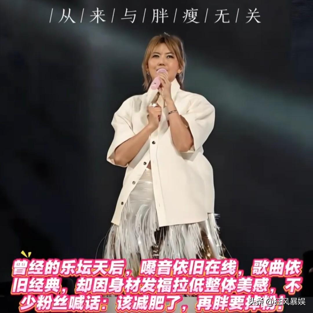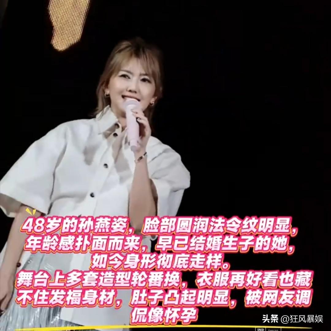 孙燕姿,演唱会引热议! 近日,孙燕姿在香港启德体育场的演唱会引起热议,不过,这一次,引起热议的话题除了歌声之外,还有造型和身材。 从现场流出的照片和视频可以看出,孙燕姿的身材比较圆润了一些,有了明显的小肚腩,脸上也有了岁月的痕迹。除了身材她的造型也引起了热议,当天她选择了白色高筒靴,高筒靴的设计紧紧包裹腿部,显出了腿部粗壮的线条。 对于这样的变化,网友纷纷直呼:“这造型值得商榷”,“有失美感”。还有网友调侃:“跟张惠妹有一拼”。 不过,孙燕姿身材有这样的变化,也可以理解,毕竟48岁了,两个孩子的妈妈了,实属正常。对于歌迷来说,只要歌声还在,才是最重要的。