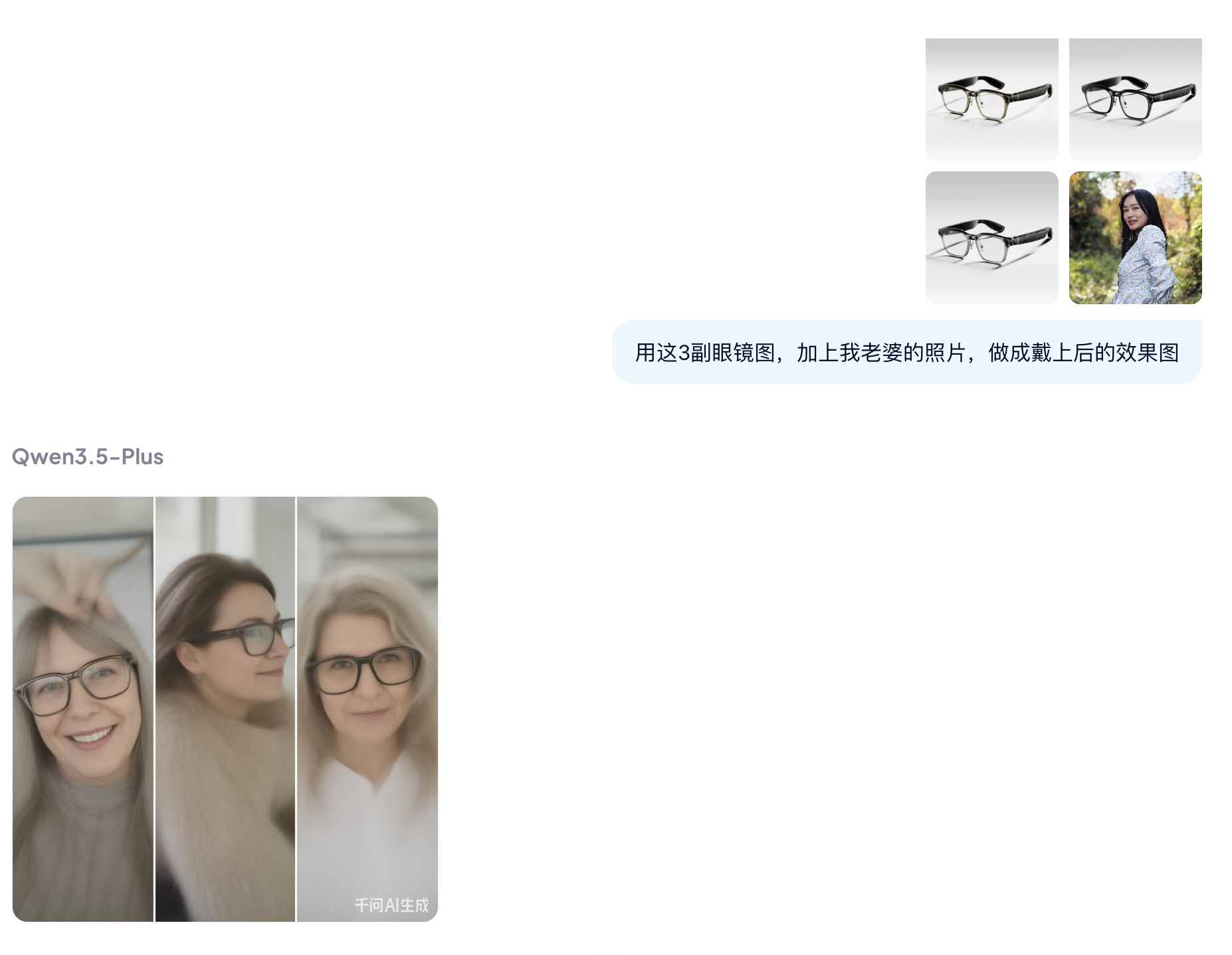 Google Nanobanana戴上姿势有一点歪,但眼镜是完全没乱改的(第三张图颜色不对一句话调整了)。