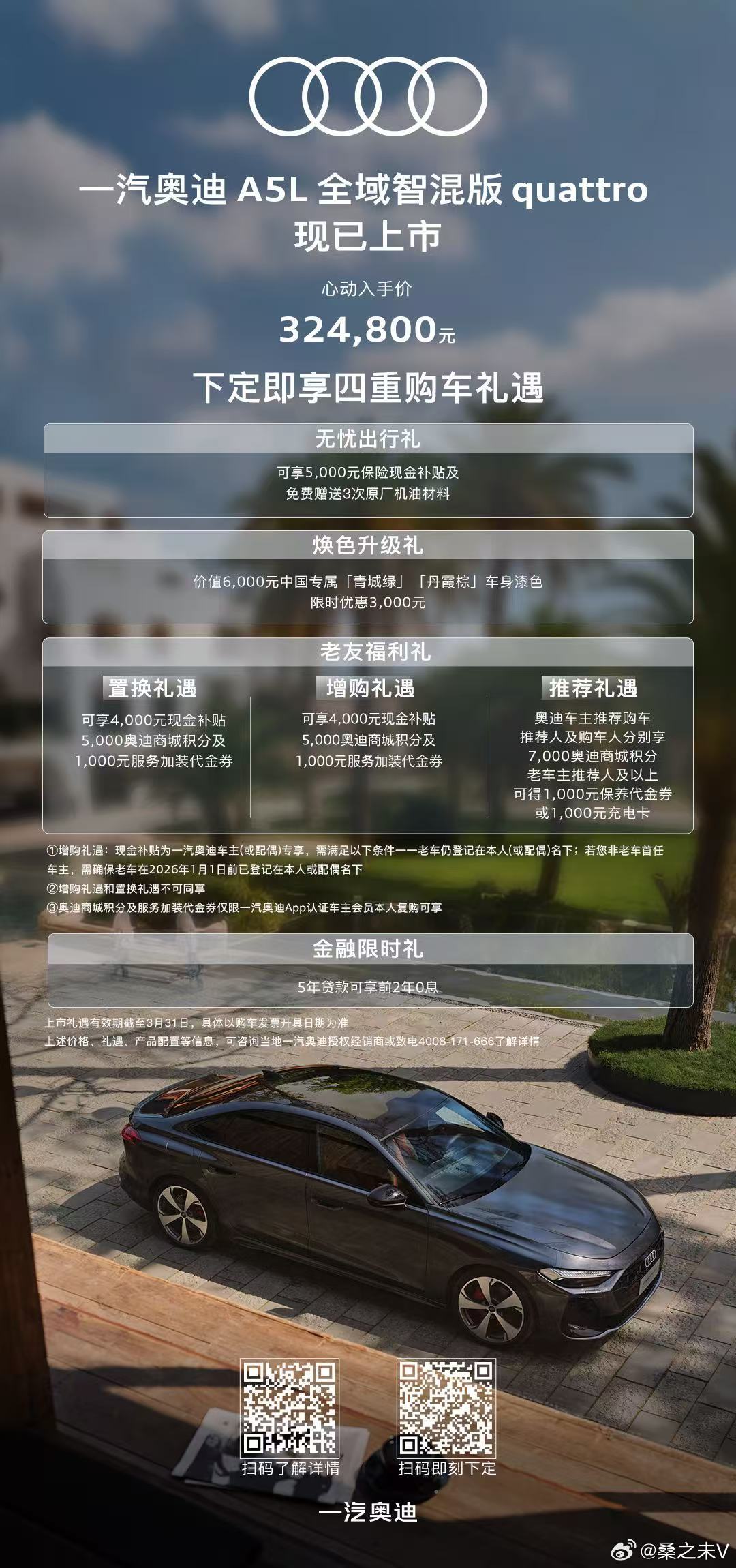 用户在2026年3月31日前下定核销且开票,可享5,000元保险补贴;限时3,000元可享价值6,000元高定专属流光漆色;奥迪车主增购、置换,可享现金等专属礼遇。此外,还有金融限时礼,5年贷款享前2年0息。