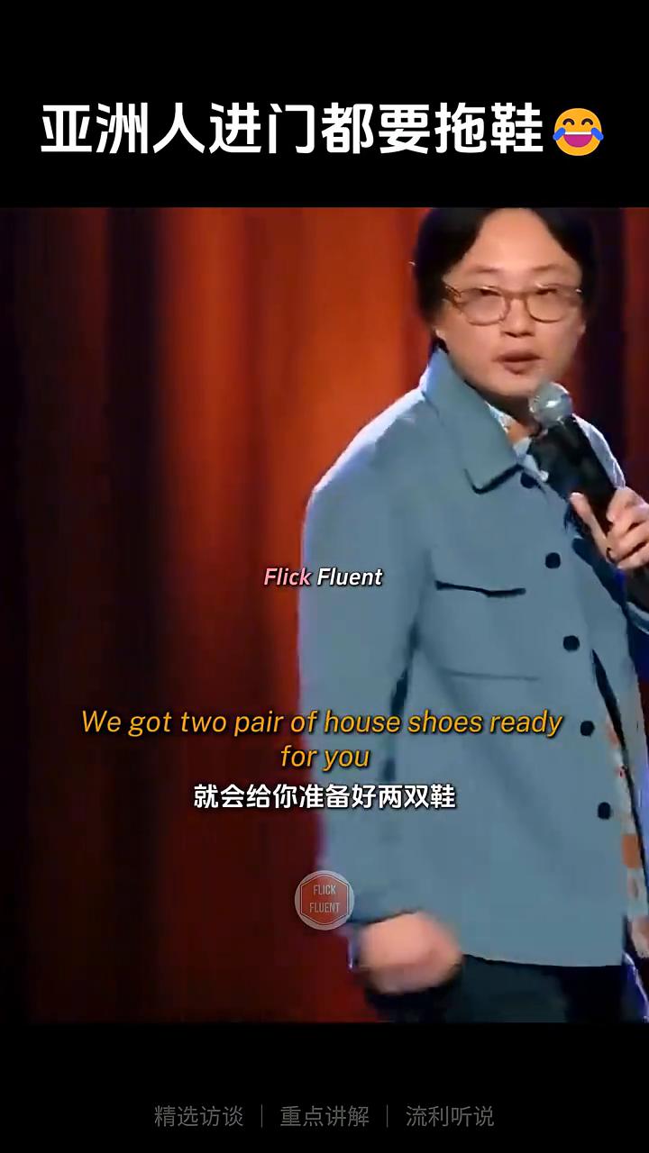 亚洲人进门都要拖鞋。 亚洲人不一定都像,除非我们需要像。你们懂规矩的,你进屋要脱鞋,对吧?你肯定会说,这谁不知道。但我们的脚其实从来没有沾过地。因为当你只要在家里脱鞋,就会给你准备好两双鞋。然后当你要走出去的时候,我们会为你准备了好洞洞鞋。然后当你回到卧室,我们还其他的两双拖鞋,是在拉斯维加斯酒店偷回来的。所以脚根本不会沾地,像婴儿脚一样嫩,软的,嫩的。
