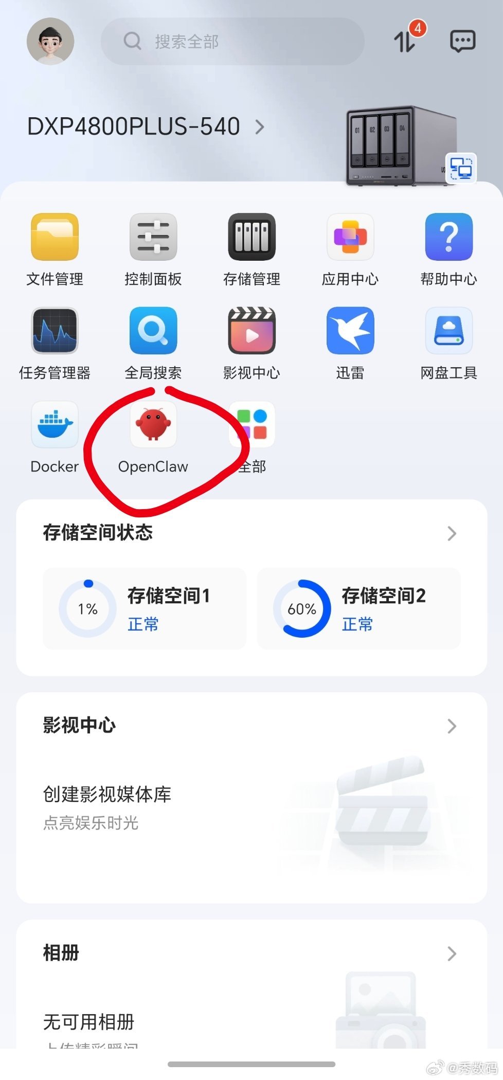 给NAS里面也养上虾了,步骤比较简单,有现成的插件,Docker里面部署Open