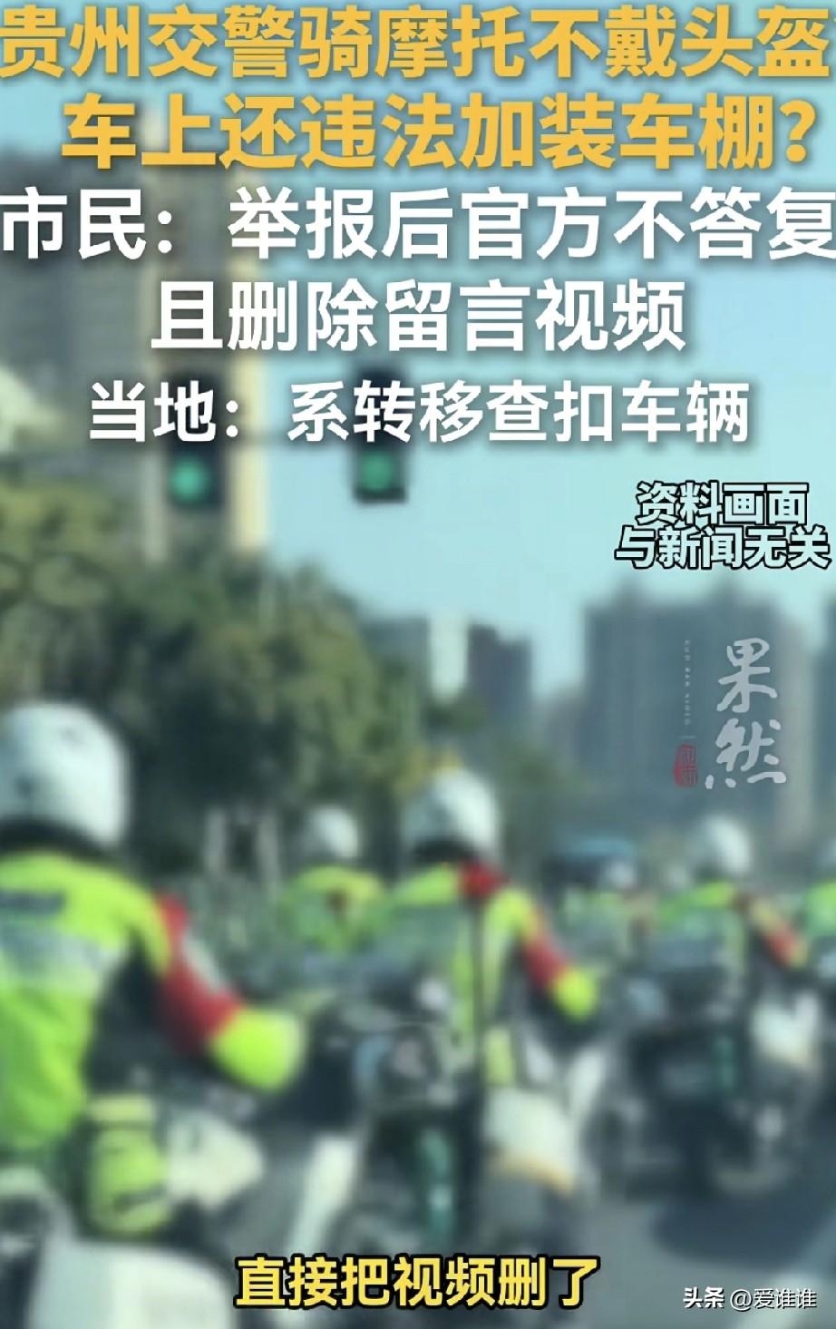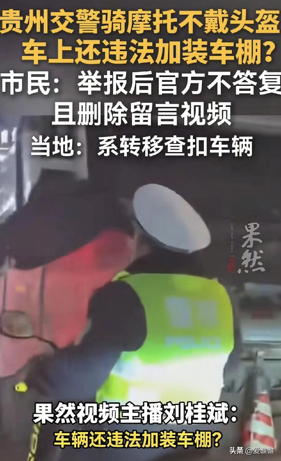 “规矩就是规矩!”贵州盘州,胡先生在街上看到一名骑电动摩托车的交警没戴头盔,车上还加了个雨棚,他当时就把这一幕拍了下来,心里挺纳闷:平时交警查老百姓不戴头盔那么严,怎么自己却不守规矩。 胡先生随后在网上举报了这件事,可等了好几天都没收到回复,他发的视频还被删了,直到媒体介入,当地交警部门才承认确有此事,工作人员解释说,当晚那名交警正在处理一辆被查扣的无牌电动摩托车,因为现场没有多余头盔,就临时骑了一下,想挪到旁边停放。 这件事传开后,不少网友议论纷纷,有人觉得不管什么理由,管规矩的人自己也不能坏了规矩;也有人认为胡先生太较真,交警也是为了工作。 我觉得大家争论的核心其实就一个理:规矩面前,是不是真的人人平等!