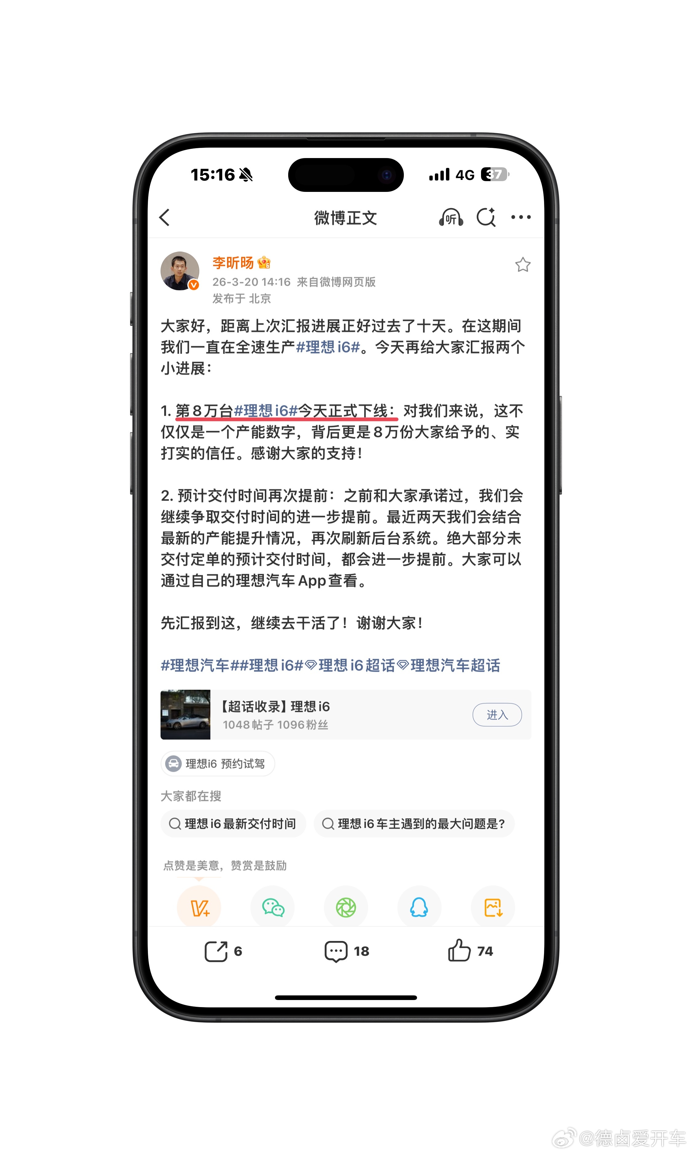 今天第80000台理想i6宣布正式下线,截止至2月底理想i6累计交付约6.2万台,3月份理想i6交付破纪录应该是必然事件,从节奏来看有望冲击单月2万台的交付量,另外宁德时代版本提车交付已调至4-6周。新能源汽车理想汽车