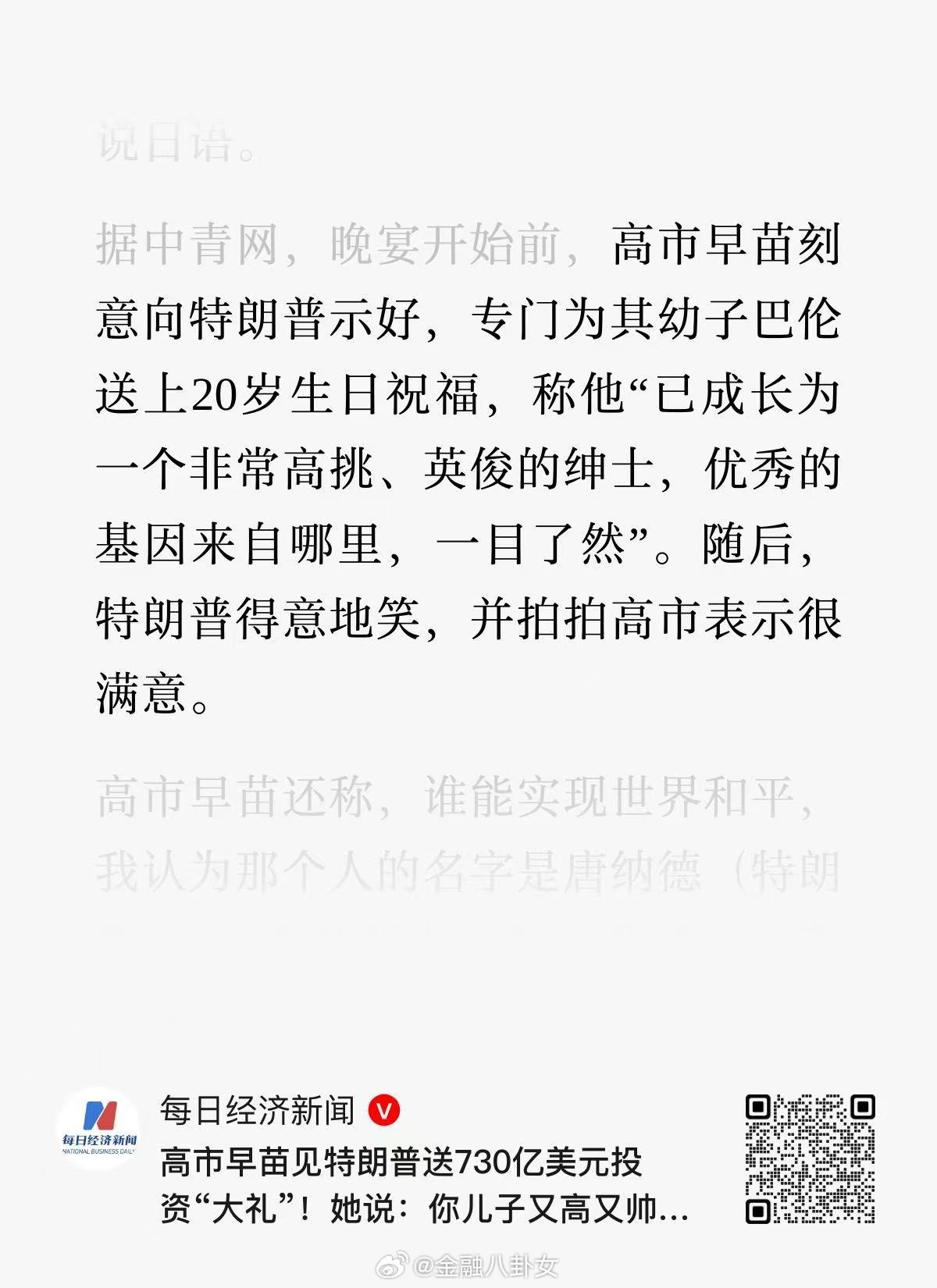 高市早苗见特朗普送730亿美元投资“大礼”!她说:你儿子又高又帅,优秀的基因来自哪里,一目了然;特朗普得意地笑了