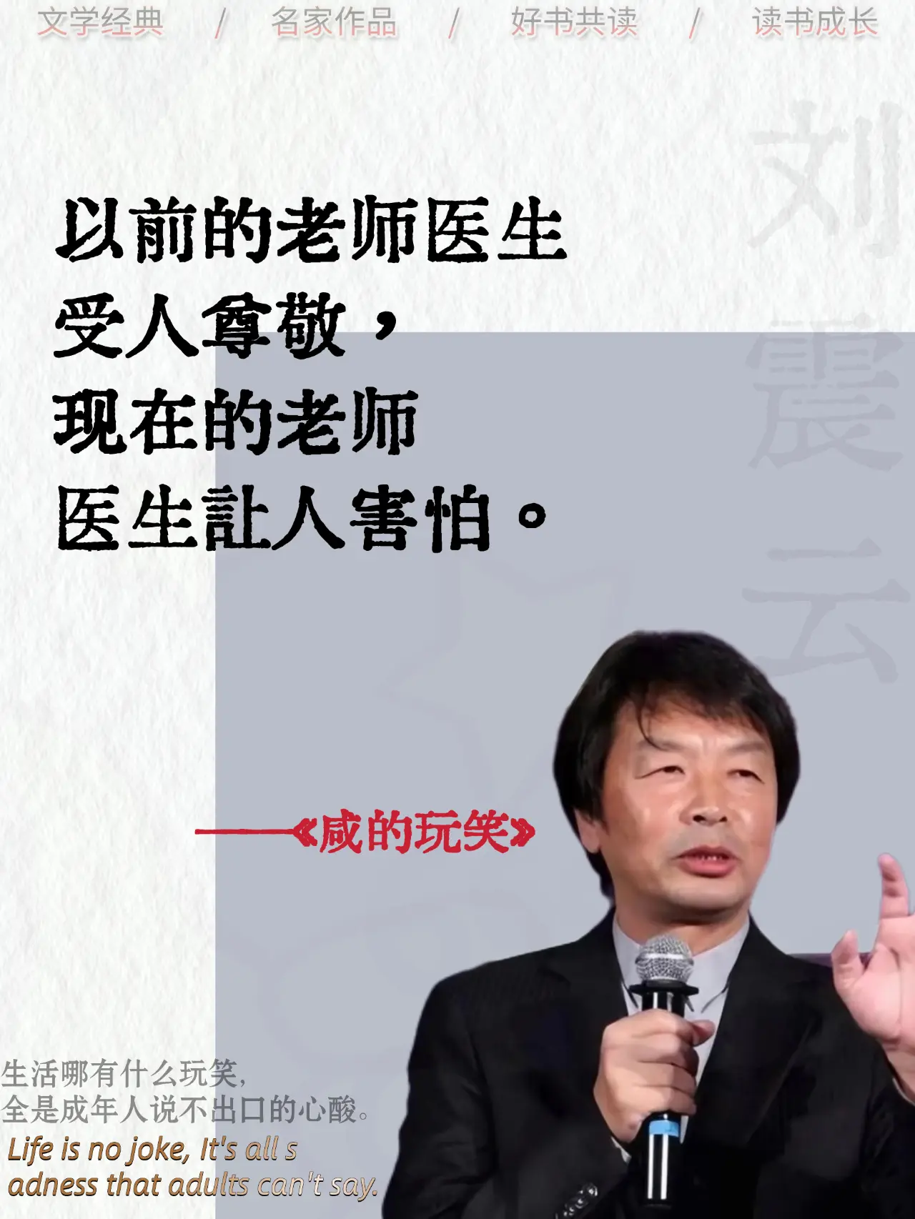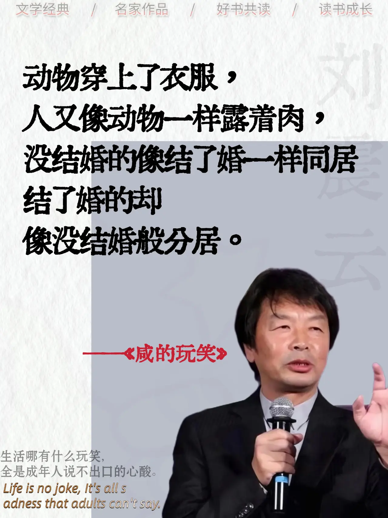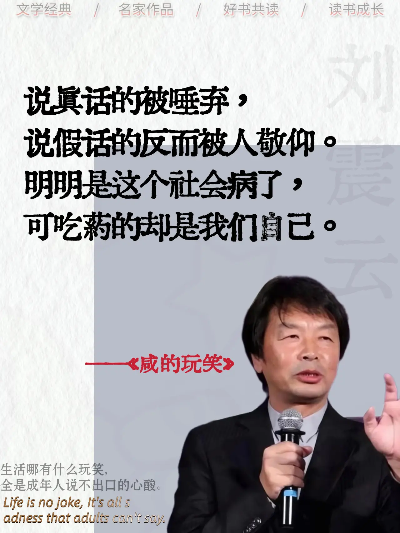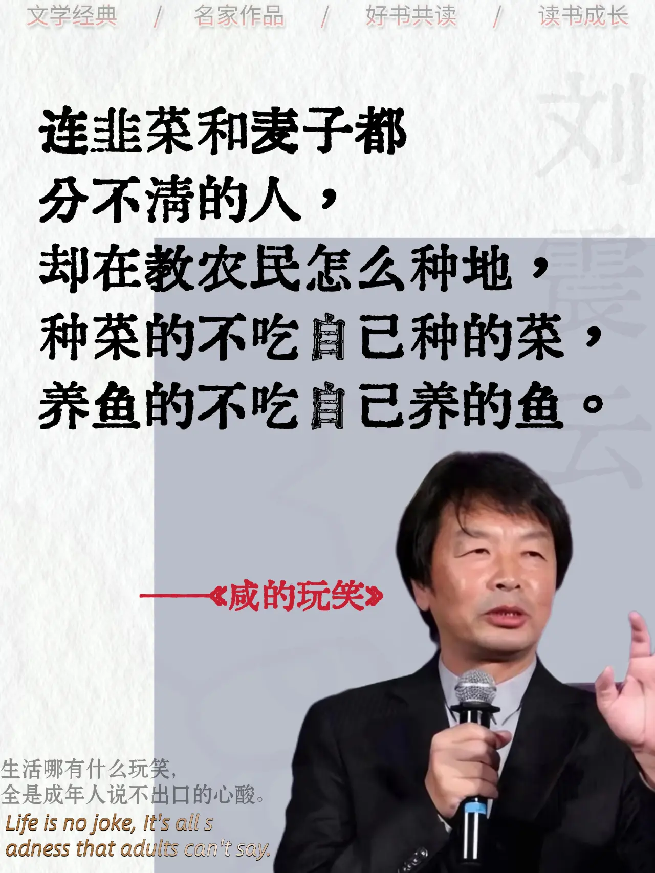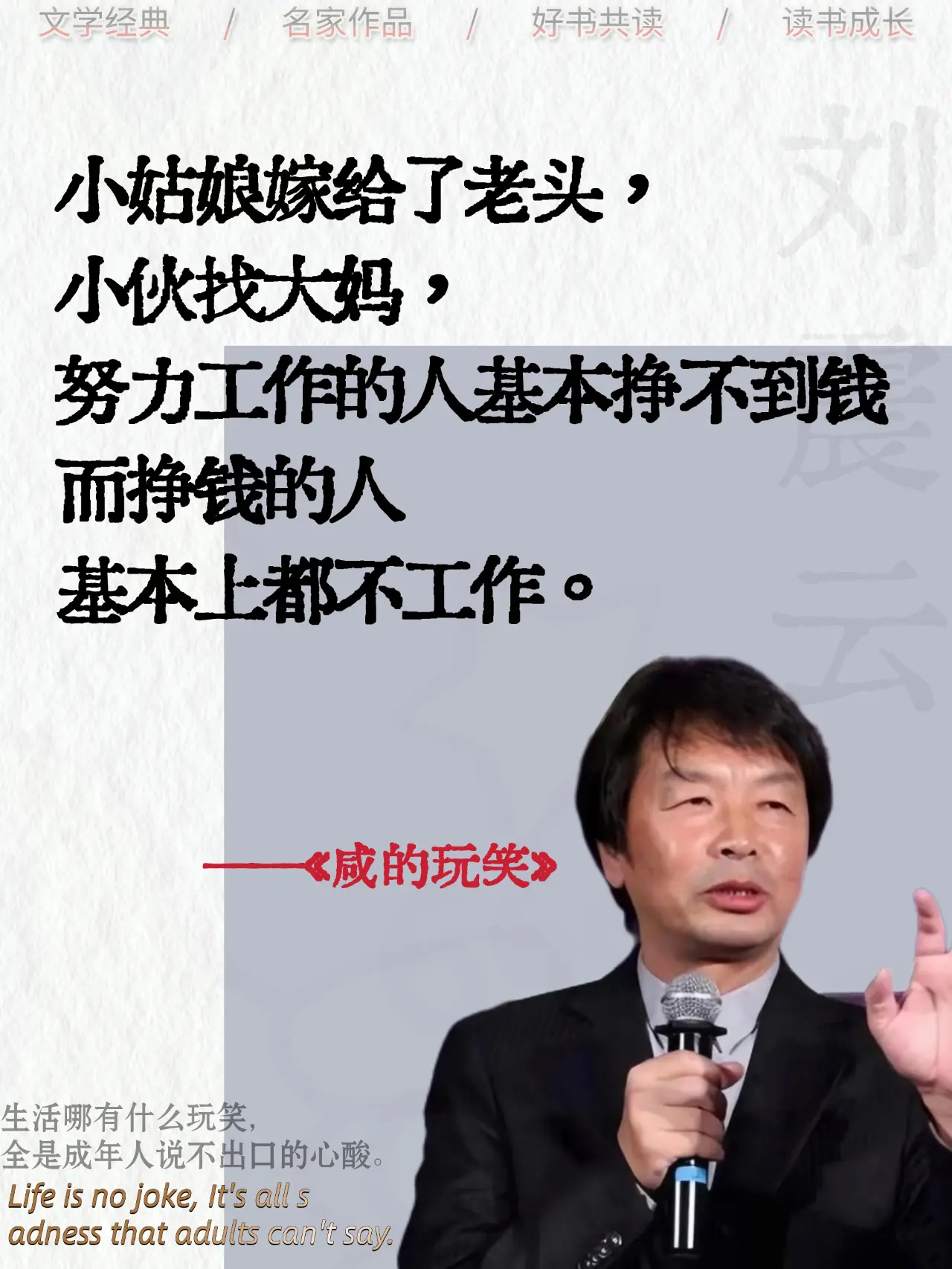 原来生活才是最会开玩笑的人!笑着接下,却在夜里偷偷擦眼泪,这本书里,写满了我们没说出口的委屈,如果你也在强撑着笑,一定要看看它!刘震云咸的玩笑好书分享读书成长文学