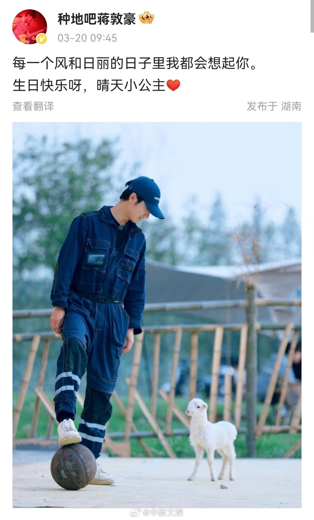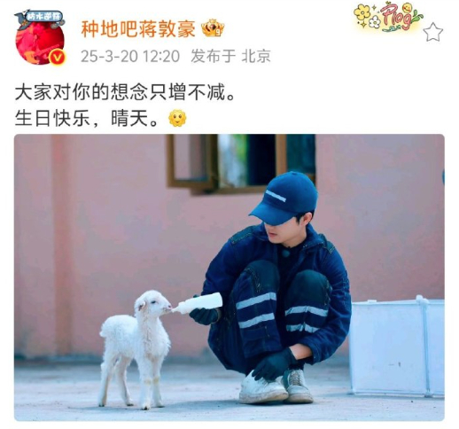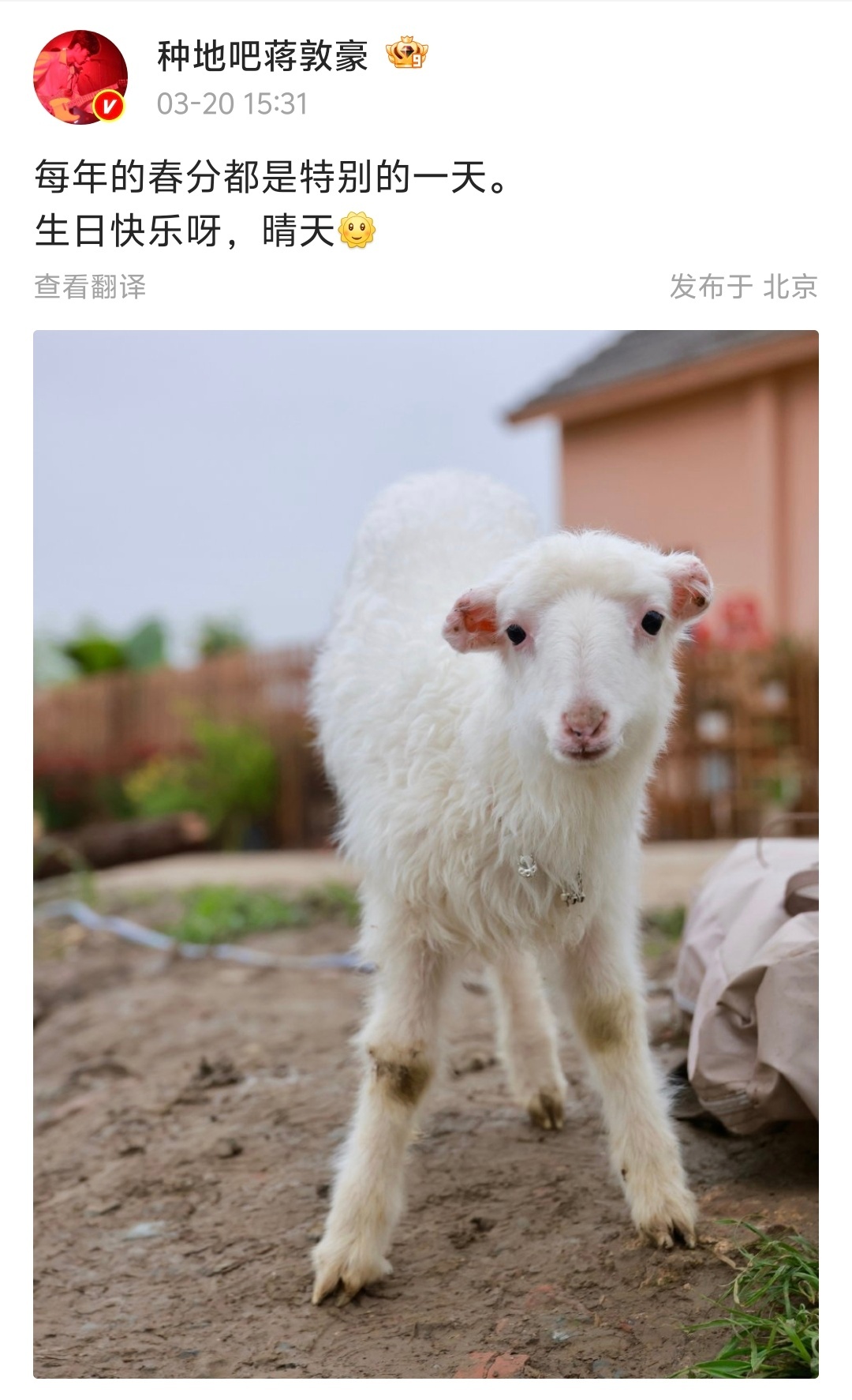 【蒋敦豪连续三年纪念小羊晴天】小羊晴天出生三周年 又是一年风和日丽的春分,追《种地吧》的朋友们,还记得那只小羊“晴天”吗?节目里,早产的小羊“晴天”出生又离开,让许多观众落泪,同时被它顽强的生命力深深打动。连续三年发文纪念↓生日快乐呀,“晴天”小公主。“每一个风和日丽的日子里我都会想起你。生日快乐呀,晴天小公主”“大家对你的想念只增不减。生日快乐,晴天。”“每年的春分都是特别的一天。生日快乐呀,晴天 ”