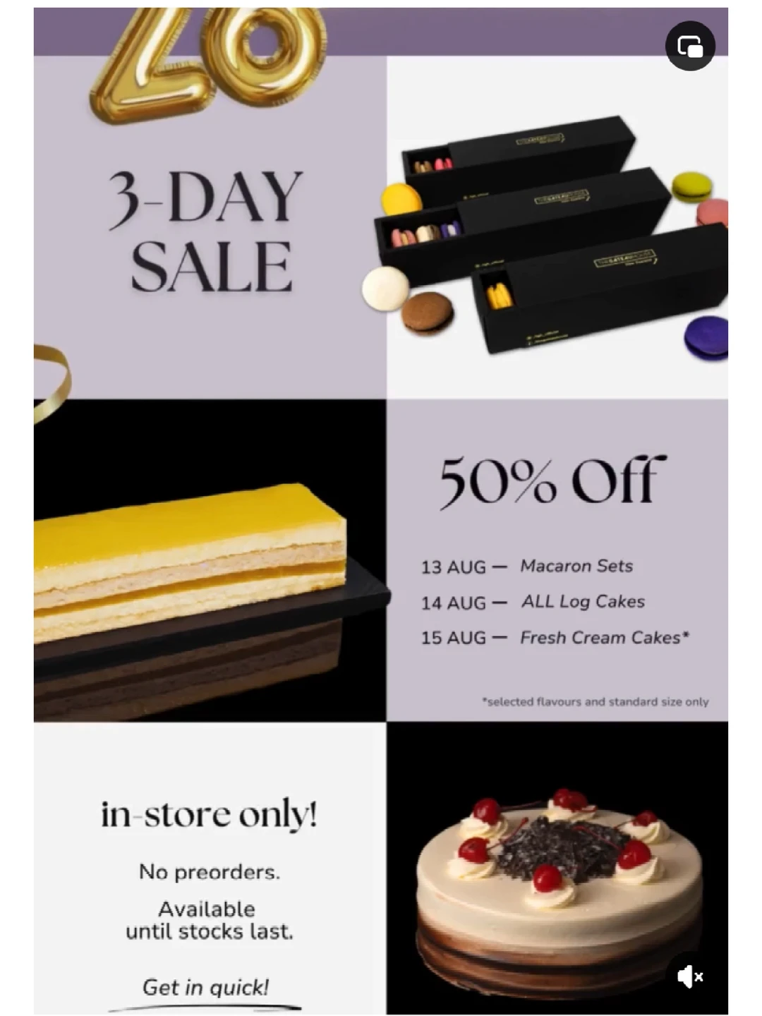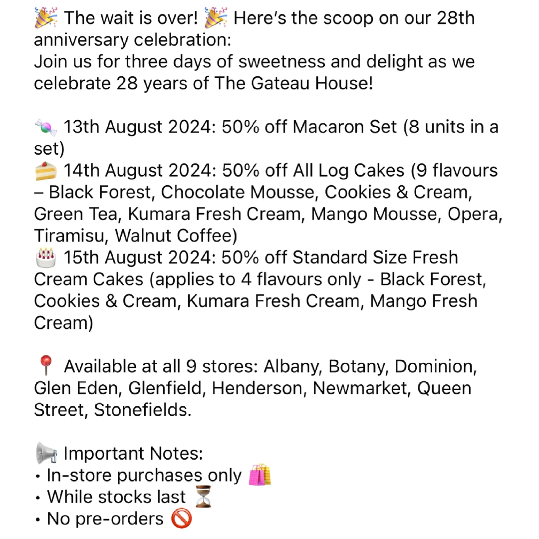 Gateauhouse韩国蛋糕店迎来了开业28周年生日店庆活动!连续三天甜品都有不同折扣[哇R] 13日(周二),马卡龙套餐20刀(原价40刀),每人限购2个; 14日(周三),原木蛋糕售价25刀(原价48刀),每人限购3个; 15日(星期四),标准新鲜奶油大小蛋糕(Kumara,曲奇奶油,黑森林,芒果)售价36.50刀(原价73刀)。 所有的折扣活动都是五折的,而且不接受预定,只能去门店购买,先到先得~赶紧去薅羊毛[色色R] 关注我,下一篇更精彩