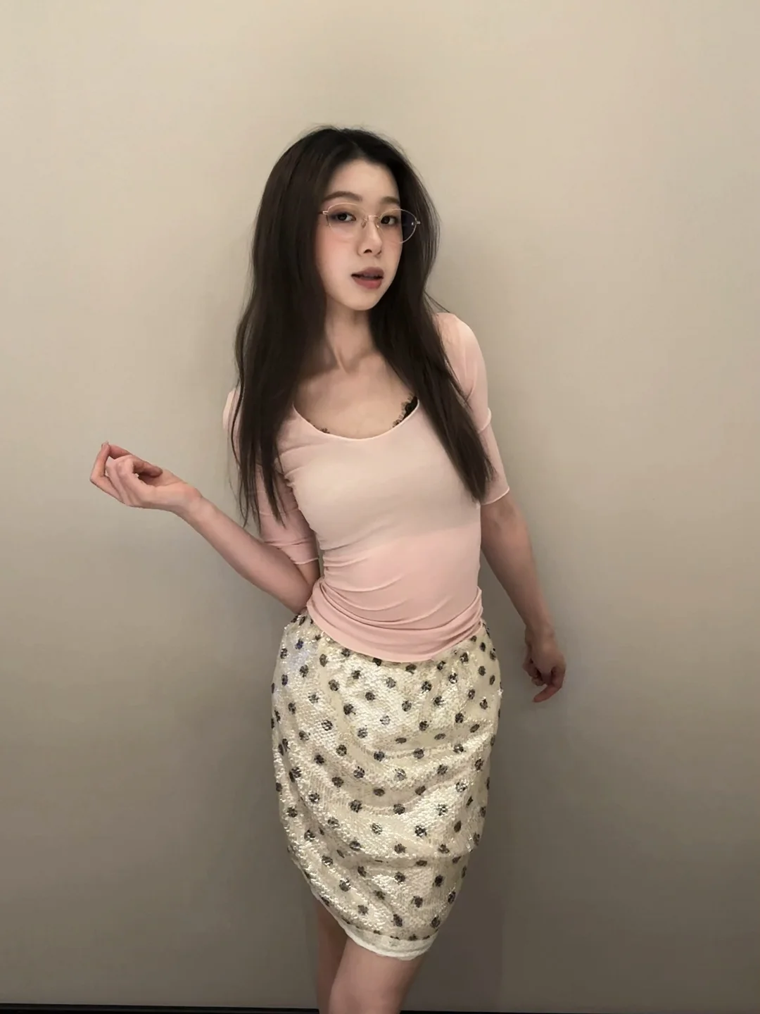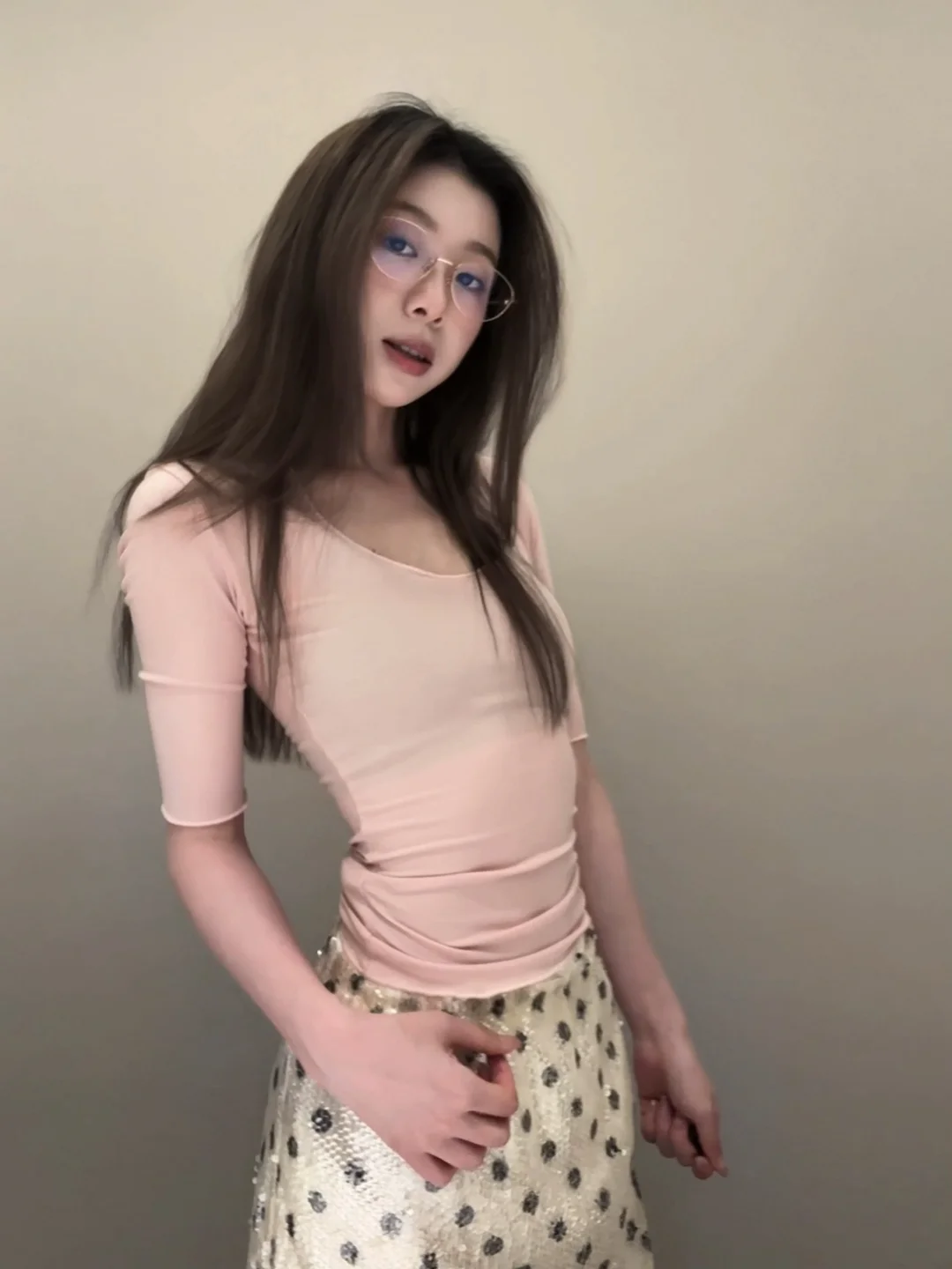 粉雾感的一天🌷 软乎乎的上衣+blingbling的小裙子 是温柔到骨子里的甜妹感呀~ 眼镜一戴,又多了几分知性慵懒感💃