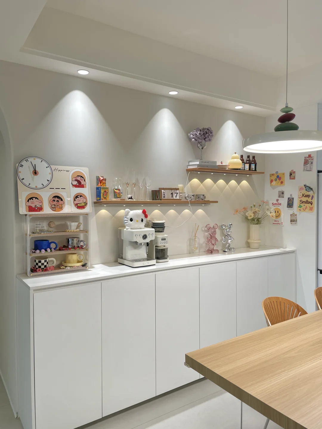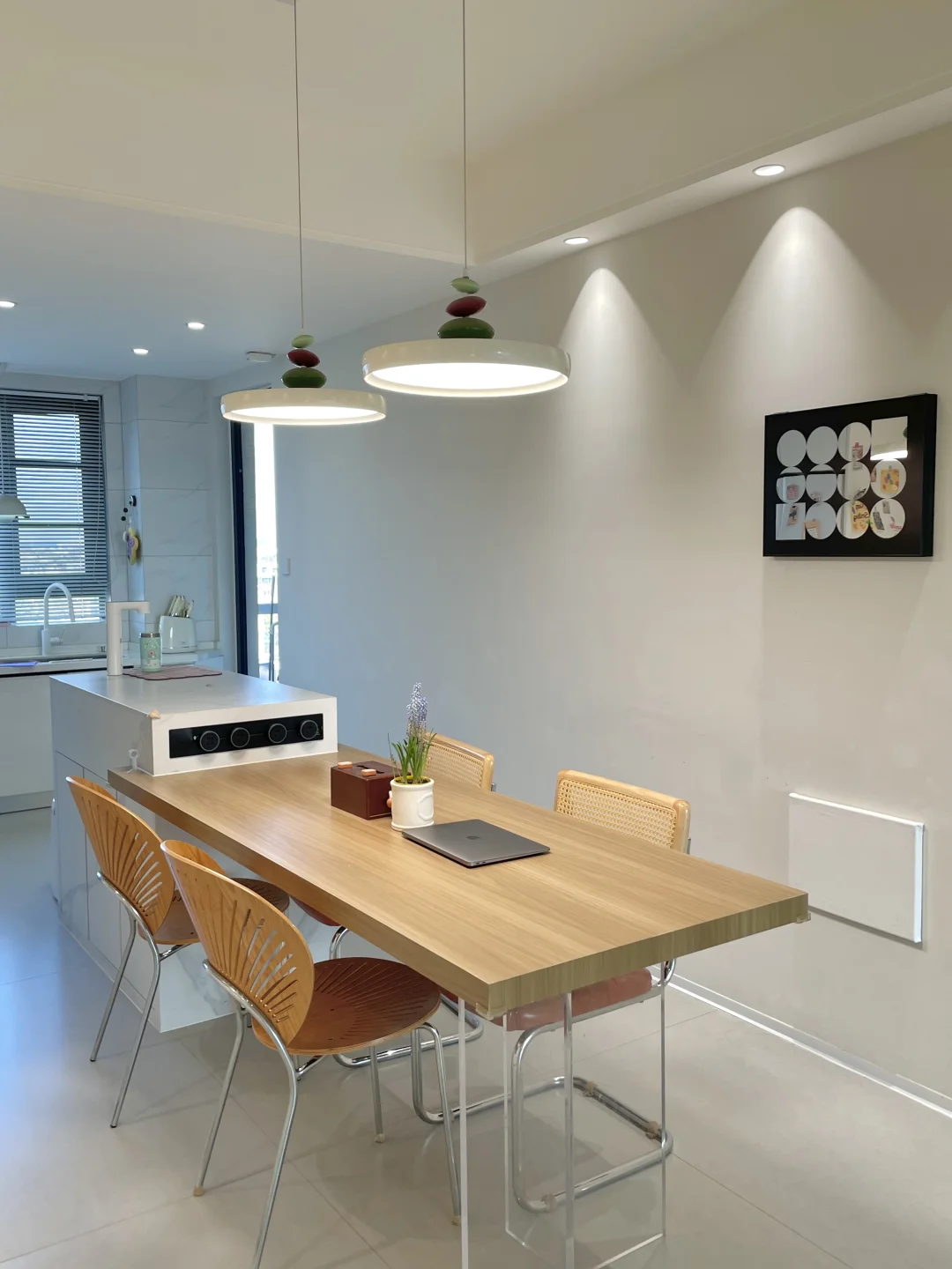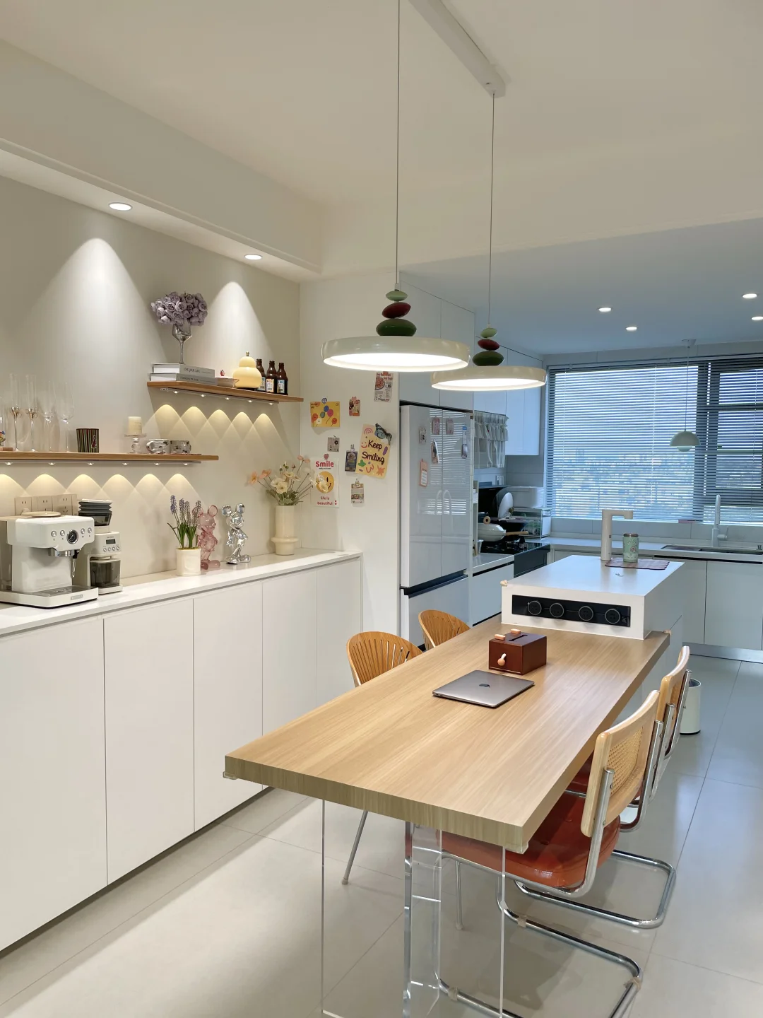 餐厅不大,开间只有2.76m 当时为了显大通透点,所以只做了半墙餐边柜 上面空间适当留白,这样视觉上显大不少 餐边柜:高1m*长2.6m*宽40cm 柜子都是选的肤感白色,白色更显亮堂 中间放岛台+餐桌设计,总长3m 用了原木色系搭配了一下,看起来温馨不少 客餐厨一体化,让整个空间显大又通透,小户型做半高餐边柜也是做够用了~
