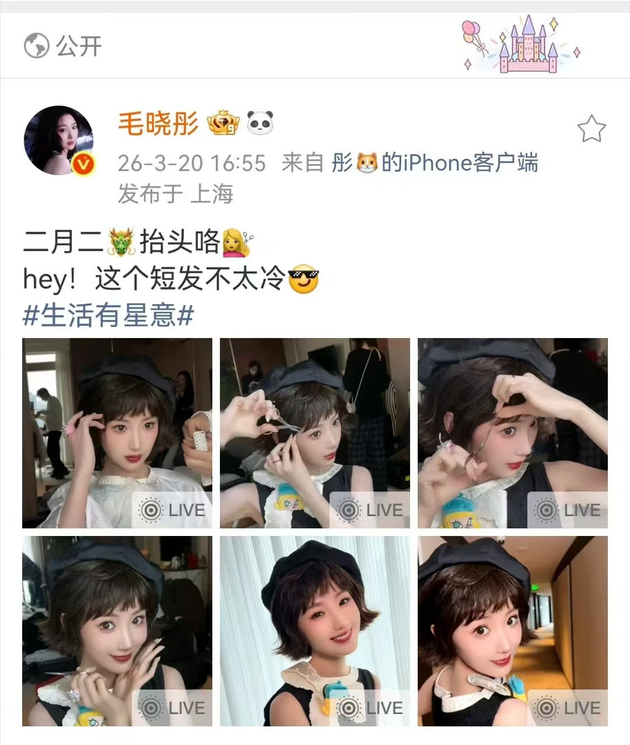 毛晓彤短发好俏皮毛晓彤二月二剪短发 二月二龙抬头,毛晓彤直接给颜值来了个抬头!短