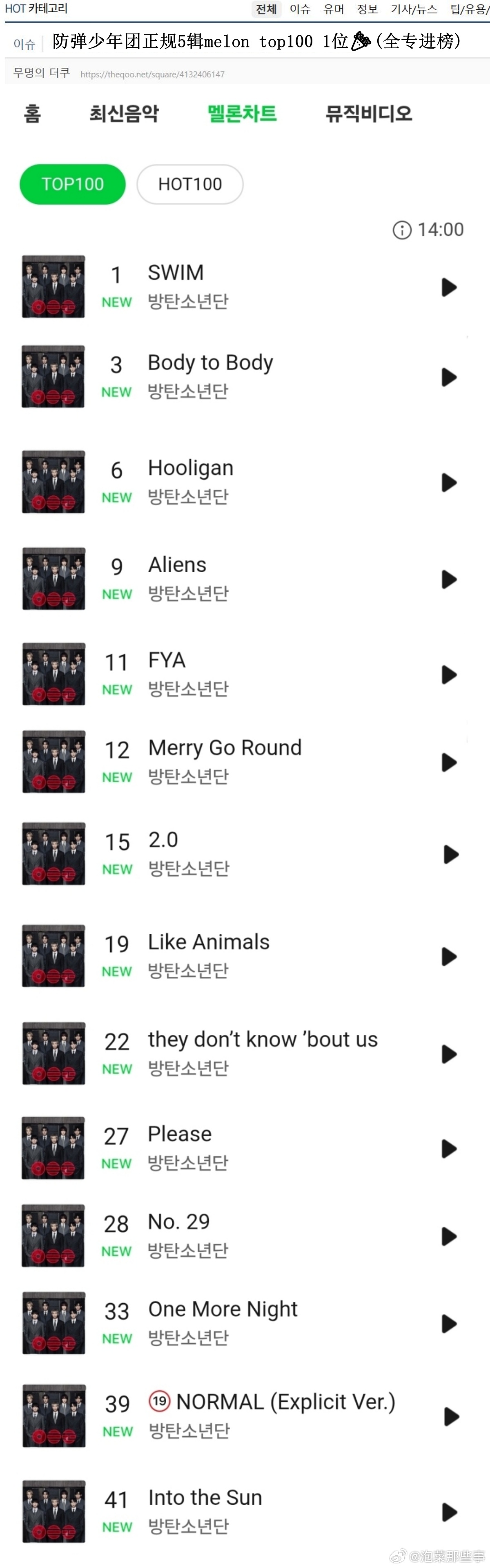 🔥韩网热帖评论翻译🔥BTS回归主打Melon Top100空降1位全专进榜BTS空降BTS新歌SWIM cr.theqoo