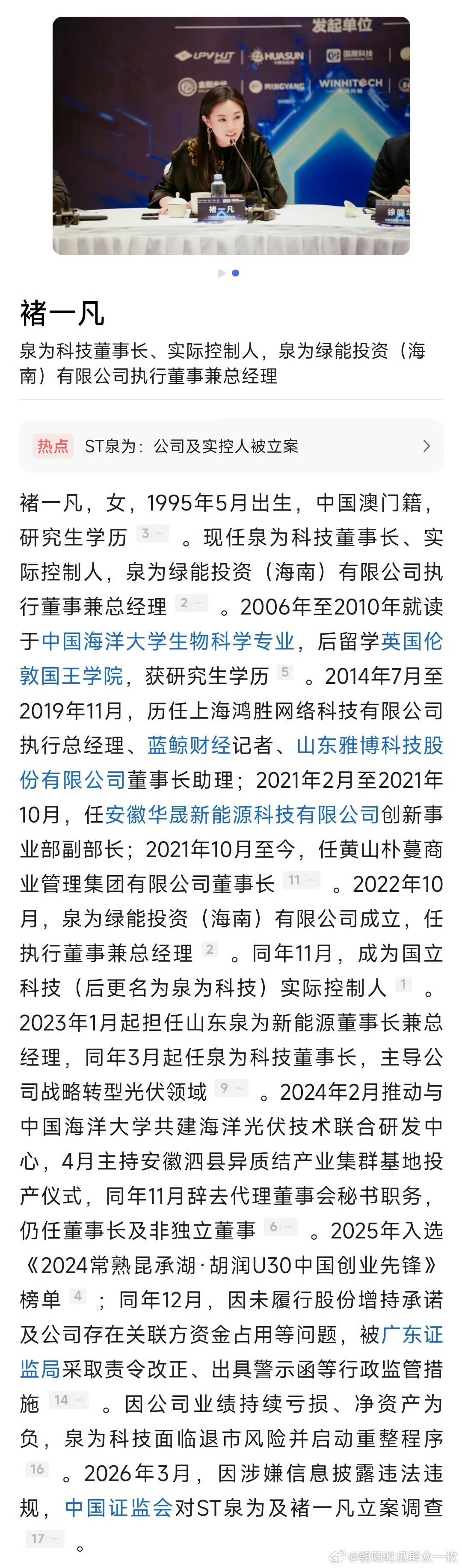 泉为科技美女董事长褚一凡被立案调查,和茅台董秘落马不一样,暂时不涉及刑事。2022年花1.96亿入股国立科技并成为实控人,更名泉为科技,把这家公司的主业从塑料转型光伏科技,和他爸的上市公司雅博股份一样。看了这家公司的营收,三季报才 4000 多万,目前已经净资产为负。现在又被立案调查,可以说是屋漏偏逢连阴雨,不知道能不能挺过这一关。