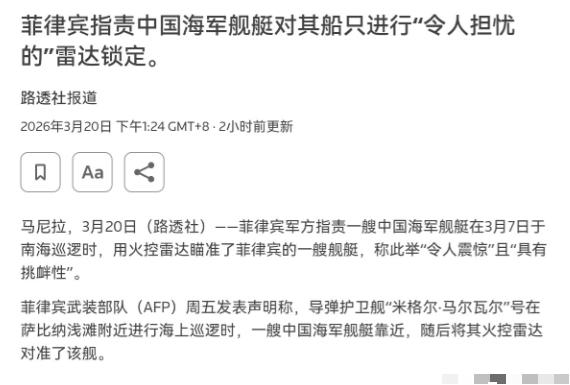 干的漂亮!直接打开火控雷达,菲律宾非常的跳脚!3月20日,根据路透社报道,外媒称,菲律宾军方指责一艘中国海军舰艇在3月7日于南海巡逻时,用火控雷达瞄准了菲律宾的一艘舰艇,称此举“令人震惊”且“具有挑衅性”。菲律宾武装部队表示,导弹护卫舰“米格尔·马尔瓦尔”号在“萨比纳”浅滩(仙宾礁)附近进行海上巡逻时,一艘中国海军舰艇靠近,随后将其火控雷达对准了该舰。 外媒称,这是一个令人震惊且具有挑衅性的举动,造成了不必要的风险,并可能导致海上误判和误解。因为火控雷达用于精确定位导弹或炮弹的目标位置。 很显然,对于我们的强硬反制措施,菲律宾非常的跳脚。 根据资料称,仙宾礁位于南沙群岛东北部,是中国南沙群岛的重要组成部分,中国渔民自古以来就在此活动,1983年中国就正式公布仙宾礁为标准名称,1987年中国科考队还曾在礁上设立考察标志,对其行使主权管辖。 菲律宾所谓的“巡逻”,本质上是未经中国政府允许,非法闯入中国管辖海域,说难听点,就是跑到别人家里撒野,中方用火控雷达发出警告,完全是合理合法的维权行为,换做任何一个主权国家,都会这么做。 而菲律宾这次的反应,简直是典型的“恶人先告状”。菲军方一边发表措辞夸张的声明,指责中方行动“令人震惊”“极具挑衅性”,一边又装出“不想把事闹大”的姿态,说希望各方保持克制,这种前后矛盾的说法,说白了就是舆论操弄。 他们心里很清楚,自己是理亏的,所以才想通过炒作“受害者”叙事,在国际上博取同情,甚至为域外国家干涉南海局势找借口,这套路和去年日本炒作“自卫队战机被解放军雷达照射”如出一辙,都是颠倒黑白、先发制人。 菲方所谓的“被火控雷达瞄准”,连技术层面都站不住脚。菲军方只含糊其辞地说“探测到来自中国军舰的信号”,但这根本不能证明是火控雷达的锁定波束——现代军舰都有被动接收信号的设备,在复杂的海上电磁环境下,很容易出现误判。 更何况,菲律宾这艘“米格尔·马尔瓦尔”号护卫舰是2025年才刚服役的新舰,在此之前,菲海军的很多舰艇连完整的信号接收设备都没有,以前遇到中方巡逻,可能连雷达信号都捕捉不到,现在好不容易有了新装备,第一次收到中方的雷达信号,就当成“被锁定”来大肆炒作,本质上就是装备更新后的认知错位,说白了就是“没见过世面”。 其实这不是菲律宾第一次在仙宾礁挑衅了。早在2024年,菲海警船就曾擅自闯入仙宾礁潟湖并长期非法滞留,中方多次提出严正交涉,菲方却置若罔闻,还多次派船企图冲闯仙宾礁,甚至以危险方式冲撞中方执法船。 中国国防部早就明确表态,中方在本国管辖海域开展维权执法活动天经地义,对于菲方的侵权滋扰行为,中方处置专业克制、合理合法,而菲方借巡逻之名带记者、拍视频,故意挑起事端、炒作悲情,就是自编自导自演的闹剧。 菲律宾之所以这么跳脚,背后离不开外部势力的撑腰。近年来,美国不断扩建在菲律宾的军事基地,和菲律宾举行联合军演,还提供安全援助,就是想把菲律宾当成棋子,搅动南海局势。 而菲律宾也想借着美国的势力,在南海谋取非法利益,不断挑衅中方底线,以为有美国撑腰,中方就会退让。 但他们显然误判了形势,中国捍卫领土主权和海洋权益的决心,从来都不会动摇,无论菲方怎么炒作,怎么勾结外部势力,都改变不了仙宾礁是中国领土的事实,也动摇不了中方依法维权的坚定决心。 很多人会担心,这样的反制会不会引发冲突?其实大家完全可以放心,中方一直秉持克制和专业的态度,采取的所有措施都是为了捍卫自身权益,避免局势升级。 我们始终主张通过和平谈判、平等协商的方式,妥善解决与周边国家的海上分歧,但克制不代表软弱,忍耐也是有底线的。 如果菲律宾继续执迷不悟,继续在南海挑衅,中方必然会采取更有力的措施予以应对,到时候吃亏的,终究是菲律宾自己。 说到底,这次中方打开火控雷达,不是挑衅,而是对菲律宾长期挑衅的一次有力反制,是在告诉全世界:中国的领土主权不容侵犯,南海不是菲律宾撒野的地方,任何侵权挑衅行为,都必将受到中方的坚决反制。 菲方与其到处哭诉、炒作闹剧,不如认清现实,停止挑衅,回到对话协商的轨道上来,这才是解决南海分歧的正确方式。
