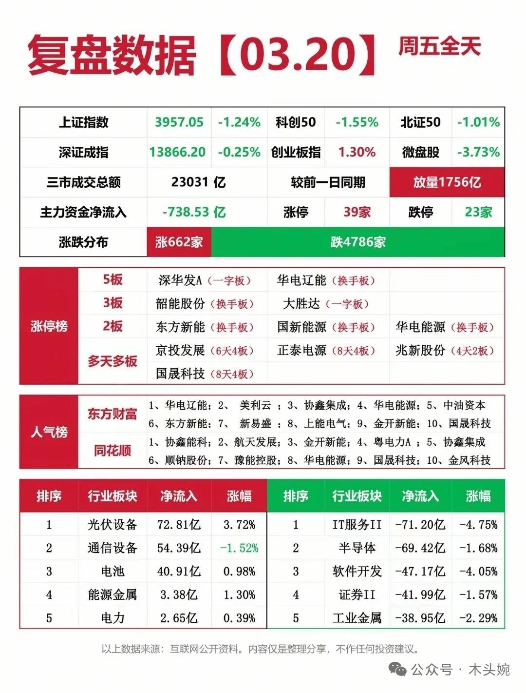 3月20复盘,指数分化,光伏逆势领涨,市场情绪待修复! 3月20日周五收盘,三大指数走势分化,沪指跌1.24%,创业板指涨1.30%,两市成交23031亿,较前一日放量1756亿,主力资金净流出738.53亿,涨跌家数约为1:7,市场情绪偏弱。 家人们,今天的盘面确实有点扎心,4786家下跌的数字看着就让人喘不过气。但是市场本就是潮起潮落,没有永远的寒冬,也没有过不去的回调。 记住:恐慌是机会的底色,逆势才是超额收益的起点。下一轮行情,一定属于那些在寒冬里依然保持理性和耐心的人!账户飘红,就在前方!