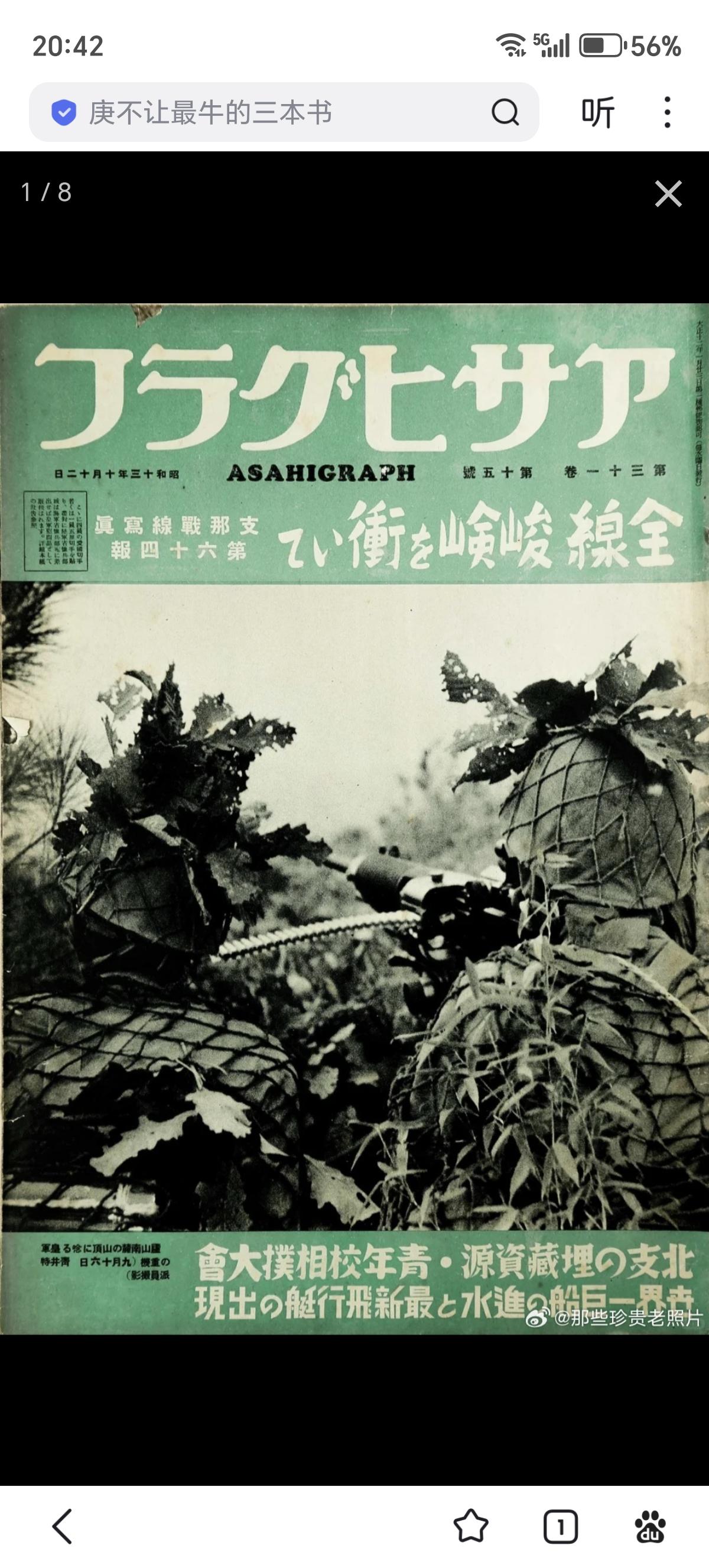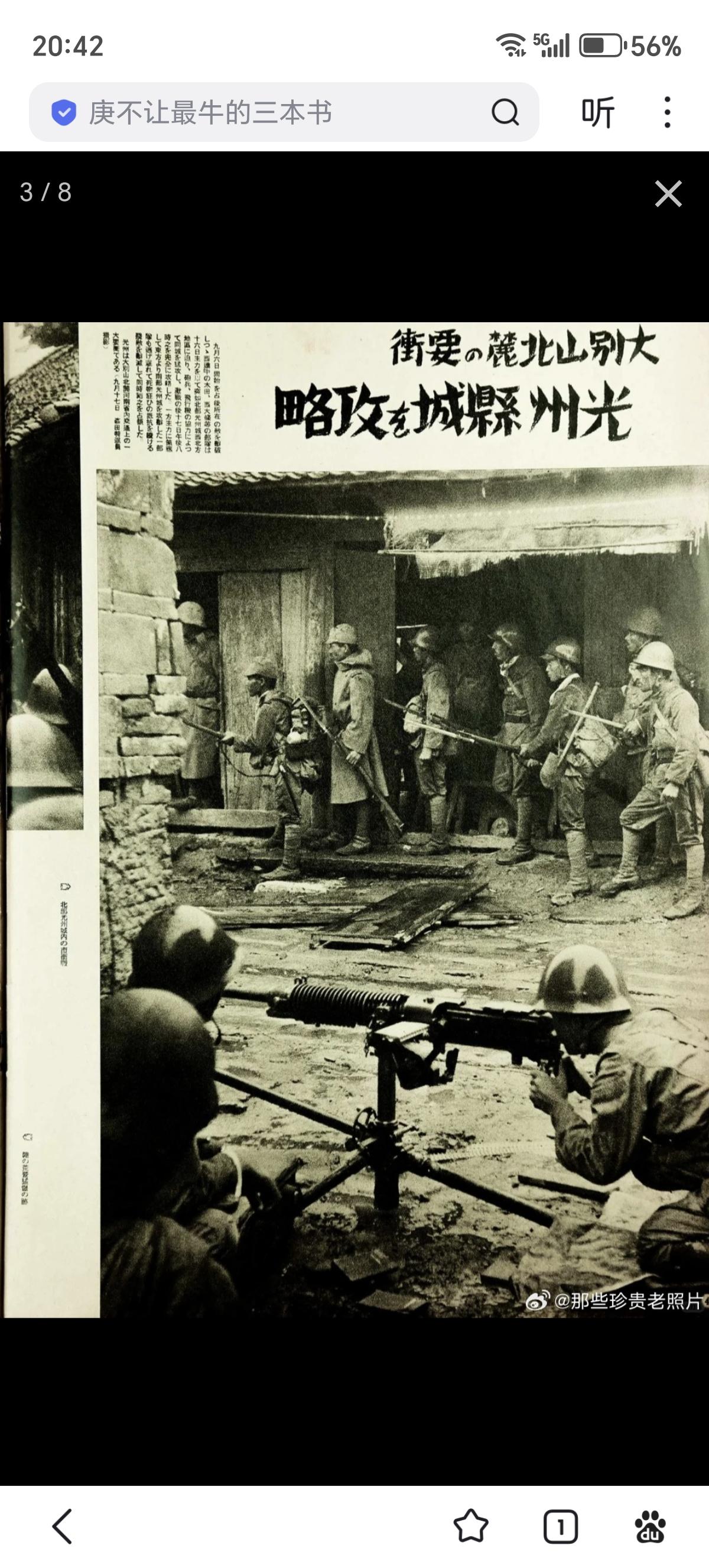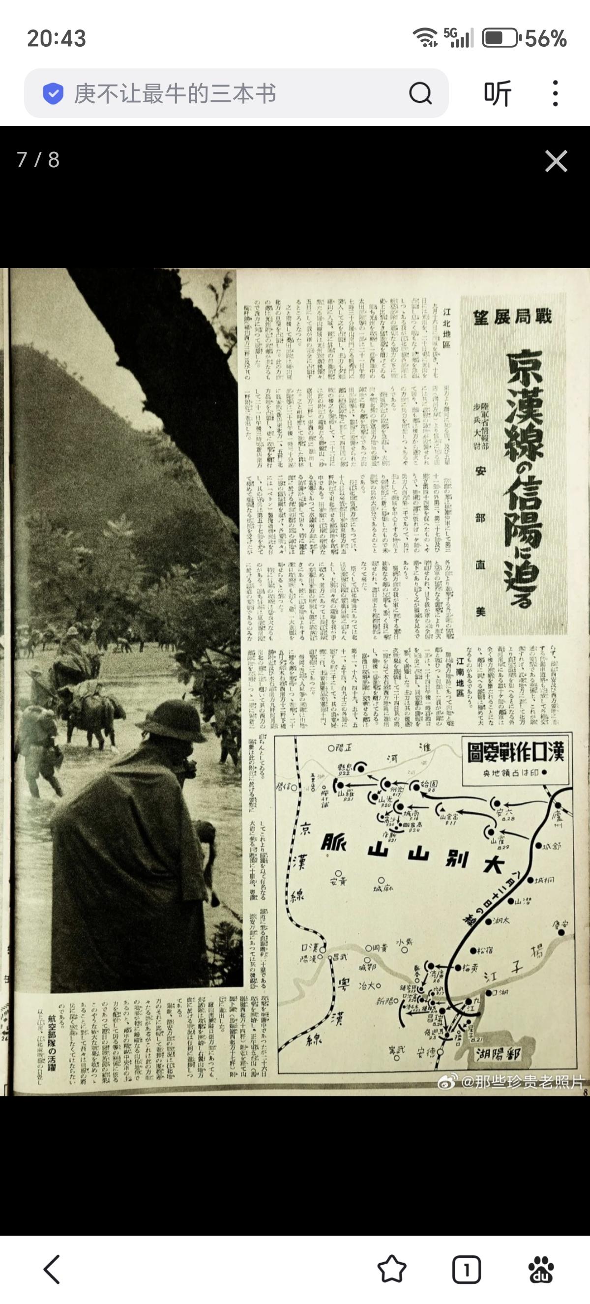 日军画报中的侵略武汉:占领光州、逼近信阳 此为日本内宣杂志日中战线写真/日中战线写真第六十四报 1938年10月12日出版 民国二十七年十月十二日出版 昭和十三年十月十二日出版 封面:庐山南麓山顶开火的日军重机枪。 图二:光州城内巷战的日军部队。(九月十七日) 图三:攻略大别山北麓要冲光州县城 图四:“扫荡”城内残敌 图五:新店——泥海中猛进(九月下旬) 图六:泥泞的大雨中燃烧植物取暖的日军 图七:战局展望“京汉线进逼信阳” 图八:九月十九日在冷雨中渡河向信阳进发的日军。