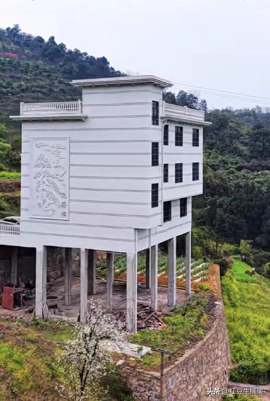 在乡下没有好位置建房的朋友看过来,强者是从来不抱怨环境恶劣的,只要想做就能成功。 就像这户人家,为了交通便利,为了能把车开到家门口,直接在通往村里的公路边斜坡上建起来四层高的楼房。所以不要抱怨在农村没有位置好的宅基地,完全可以创造嘛。 像这个山斜坡挖平,在钢筋混凝土浇筑承重柱,还是很稳当的。