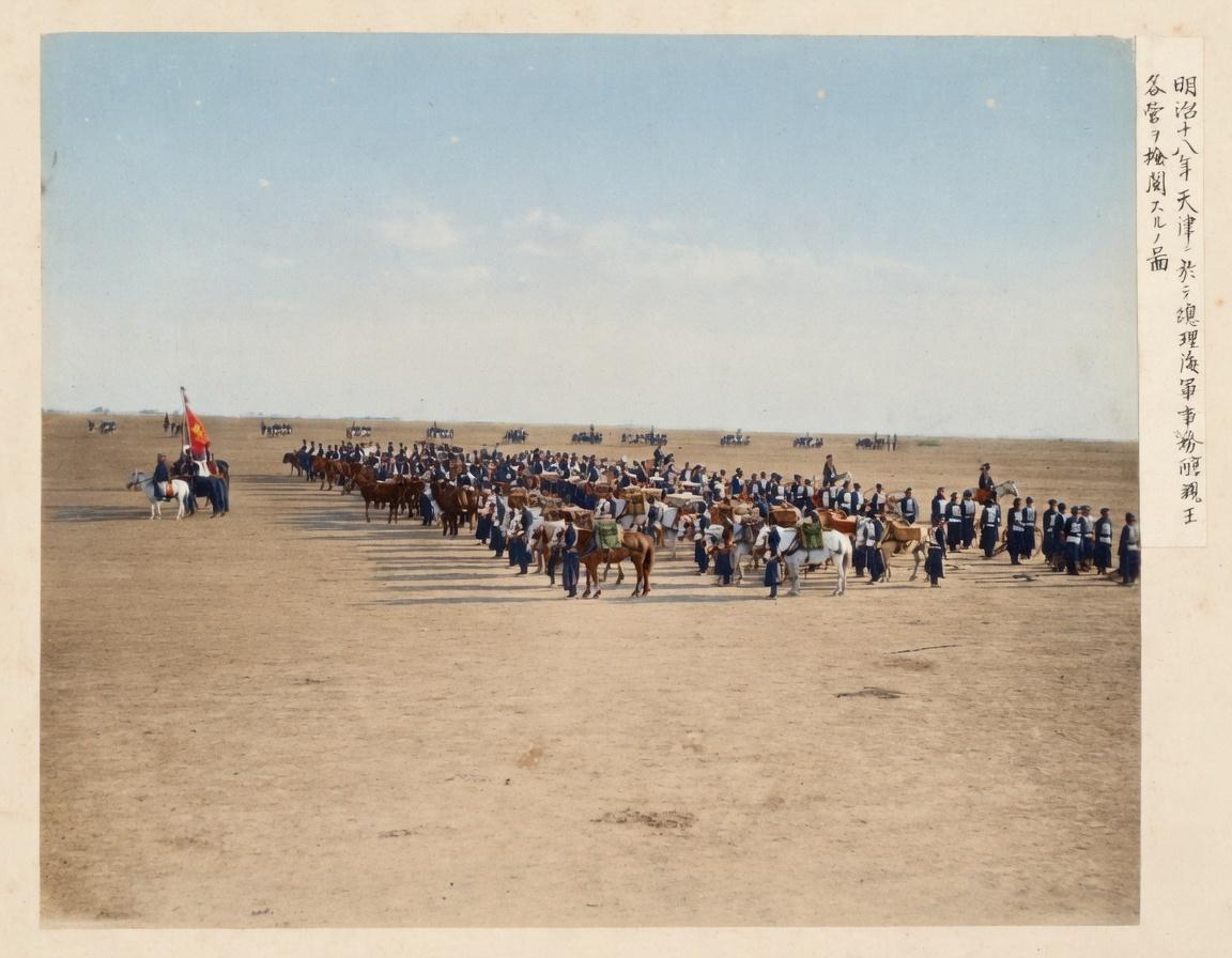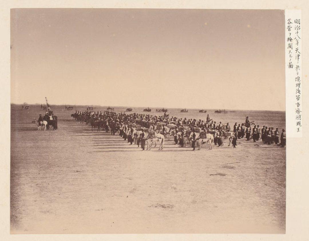 1886年,天津,醇亲王奕譞检阅北洋各营的阅兵现场。这张照片由日本摄影师拍摄,右侧日文注释“明治十八年天津ニ於テ總理海軍事務醇親王各営ヲ檢閱スルノ圖”。 开阔的华北平原上,清军队列严整,骑兵、步兵与辎重/炮兵队伍依次排开,军旗猎猎,展现了洋务运动后清军“师夷长技”的近代化成果,正试图撑起大清的海防。可谁也没想到,这场向日本示威的表演,成了北洋水师最后的绝唱——8年后,甲午海战全军覆没,这张照片也成了晚清自强运动最讽刺的挽歌。