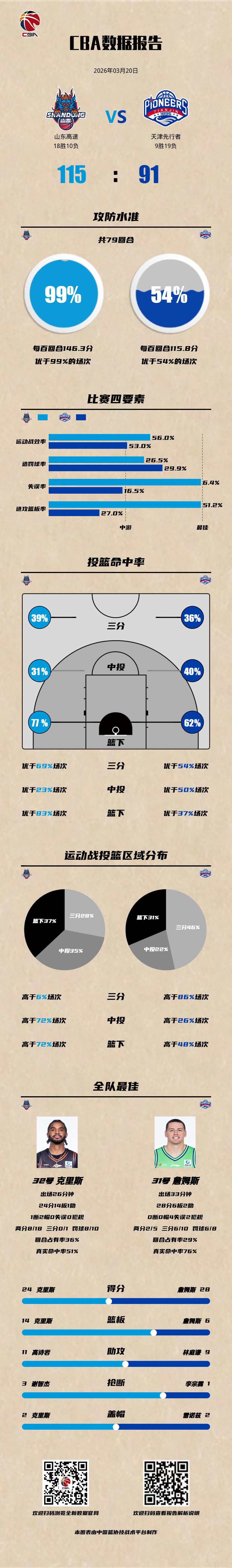 山东高速 115-91 天津先行者 山东男篮vs天津男篮 山东高速:克里斯24分14篮板2盖帽,约翰逊17分4篮板,高诗岩15分10篮板11助攻3抢断; 天津先行者:詹姆斯28分6篮板,林庭谦18分9助攻,蒋祺禹18分7助攻。以城之名