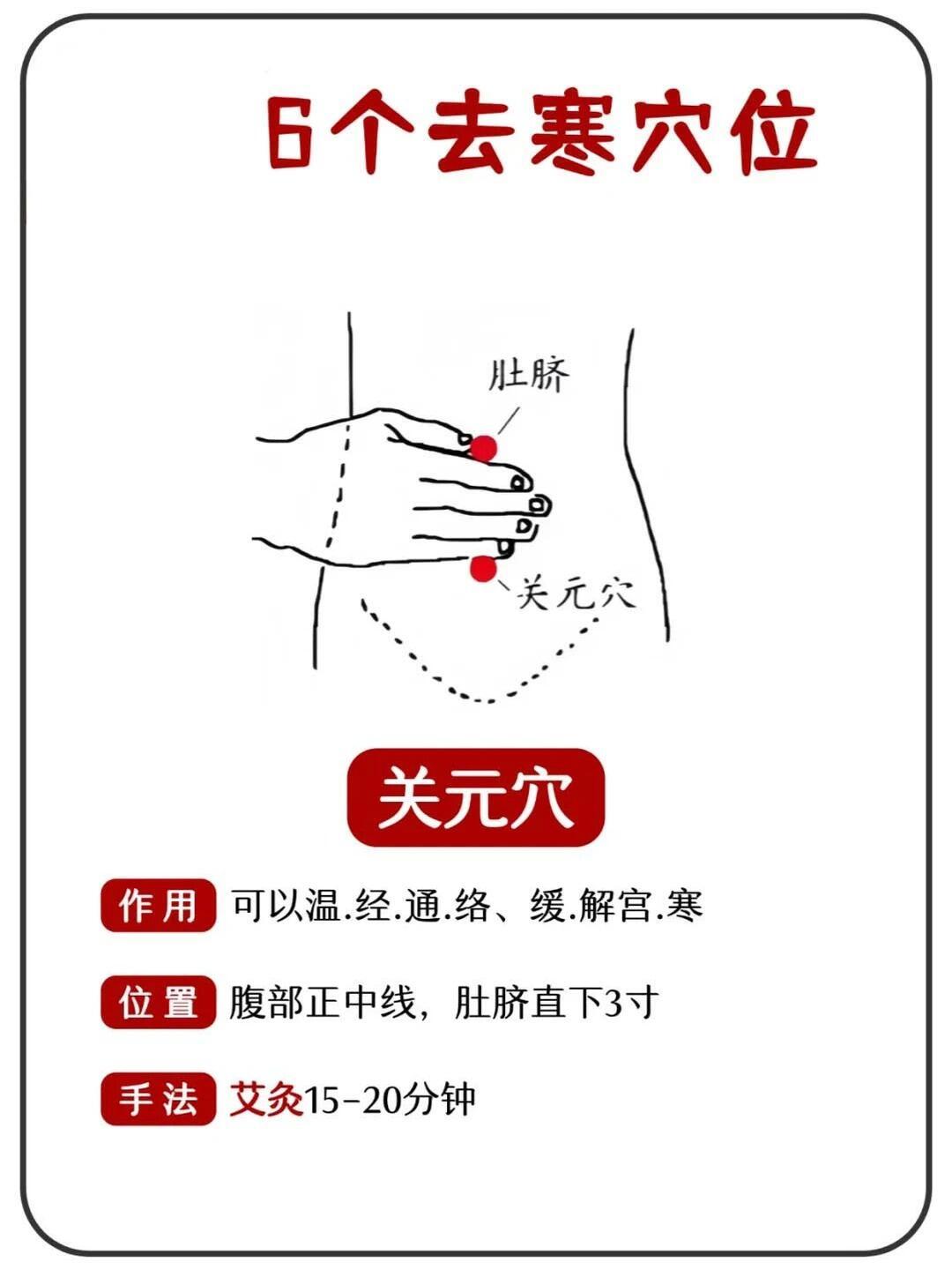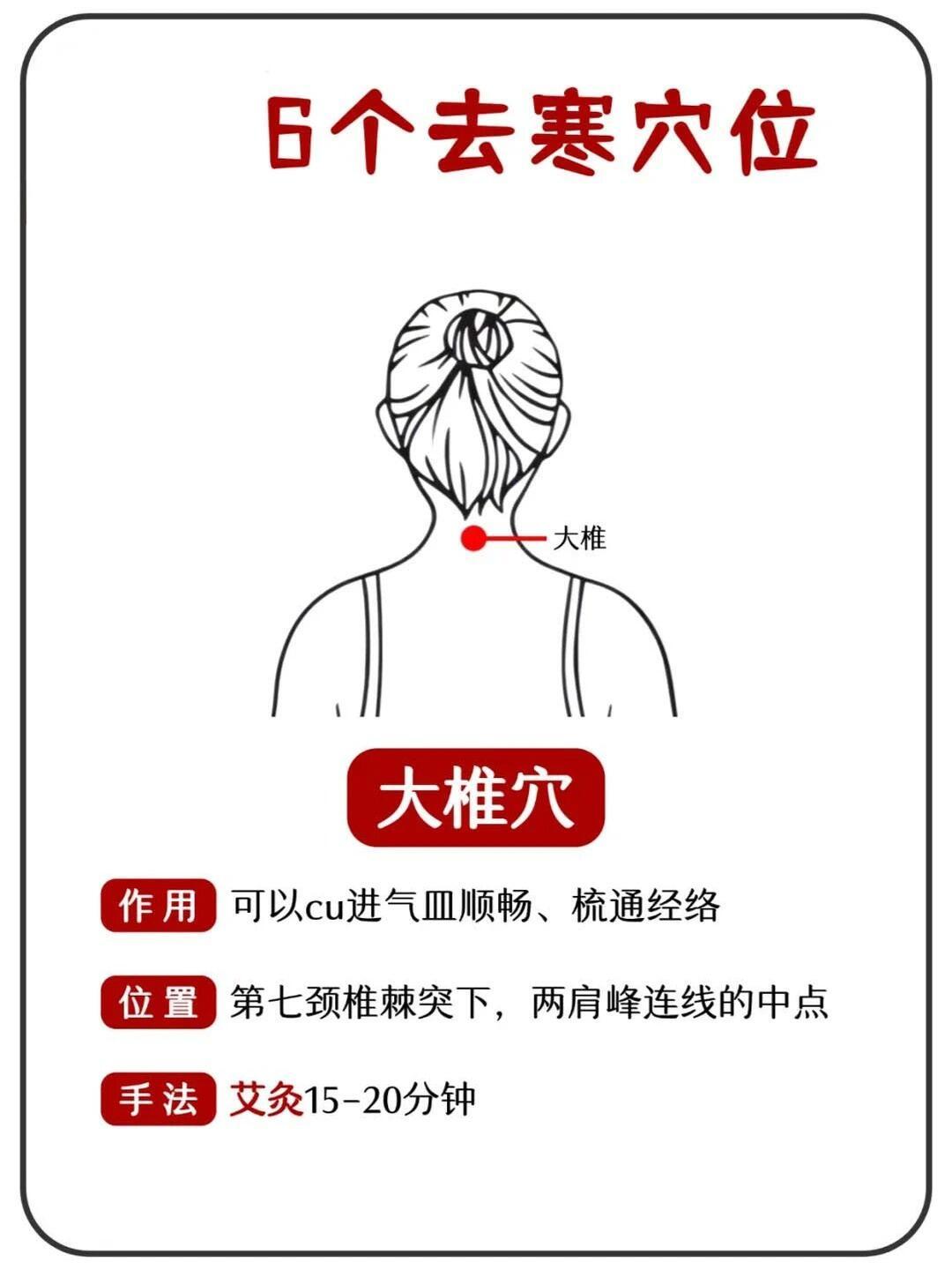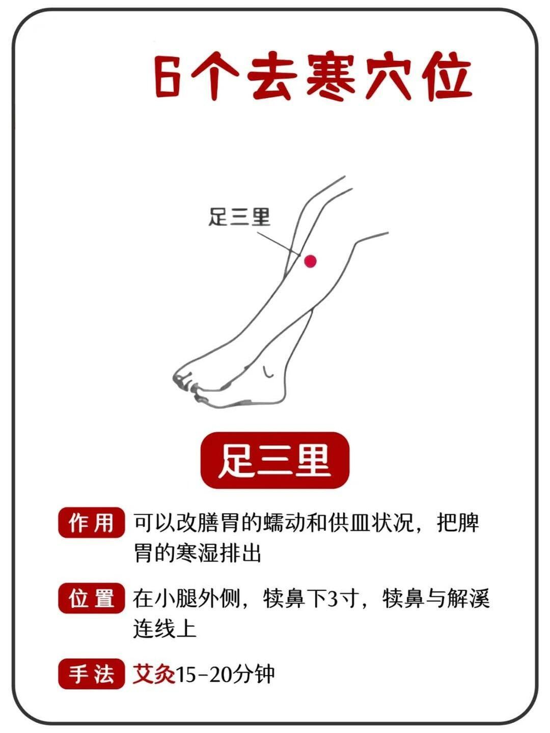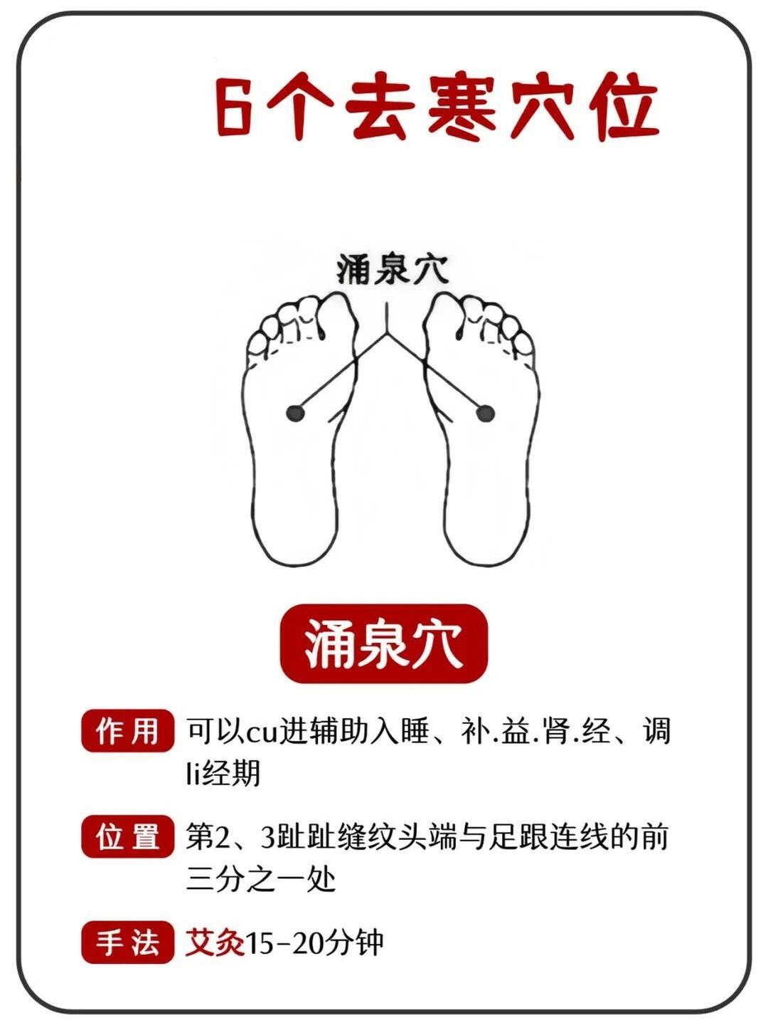 1. 足三里穴(长寿大穴,健脾祛湿)定位:在小腿外侧,犊鼻穴(外膝眼)下3寸,距胫骨前缘一横指(中指)。简单找法:坐姿屈膝,手掌捂在膝盖上,中指指尖点到的位置即是。为何驱寒:脾胃是气血生化之源,脾胃虚寒则全身失养。刺激足三里能生发胃气,补益气血,气血足了,身体才有能量去抵御和驱散寒邪。2. 大椎穴(阳中之阳,散热驱寒)定位:在脊柱区,第7颈椎棘突下凹陷中,后正中线上。找法:低头,脖子后最突出骨头下方的凹陷处。为何驱寒:大椎是手足三阳经与督脉的交会穴,总督一身之阳气。受寒初期(如打喷嚏、流清涕、脖子僵硬),刺激此穴能激发阳气,驱邪外出。3. 涌泉穴(补肾壮阳,引火归元)定位:在足底,屈足卷趾时足心最凹陷中。约当足底第2、3趾趾缝纹端与足跟连线的前1/3与后2/3交点处。为何驱寒:肾为先天之本,内藏元阳。寒为阴邪,最易伤阳。涌泉是肾经的起始穴,常刺激能使肾阳充足,就像给身体加了把火,温暖从脚底升起。4. 命门穴(生命之门,温补肾阳)定位:在腰部,当后正中线上,第2腰椎棘突下凹陷中。简单找法:肚脐水平线与后背正中线的交点。为何驱寒:命门藏匿着人体的真火,称为“命门之火”。对于因肾阳不足导致的腰膝酸软、畏寒肢冷、五更腹泻等,艾灸命门是温阳驱寒的首选。5. 关元穴(元阴元阳,补虚益损)定位:在下腹部,前正中线上,当脐中下3寸。约四指横宽的距离。为何驱寒:关元是养生吐纳吸气凝神的地方,古人称为“人身元阴元阳交关之处”。此穴能大补元气,对一切阳虚证、体寒证均有良效,尤其适合女性宫寒、男性虚冷。6. 太溪穴(滋阴益肾,水火同调)定位:在足内侧,内踝后方,当内踝尖与跟腱之间的凹陷处。为何驱寒:这是肾经的原穴,是肾的原气经过和留止的地方。它不仅补肾阳,也能滋肾阴,起到调节阴阳平衡的作用。对于因肾虚引起的虚寒(如既怕冷又手心脚心有点热)有双向调节作用。国医的精诚力量微博中医药月