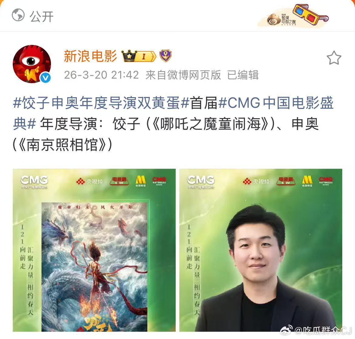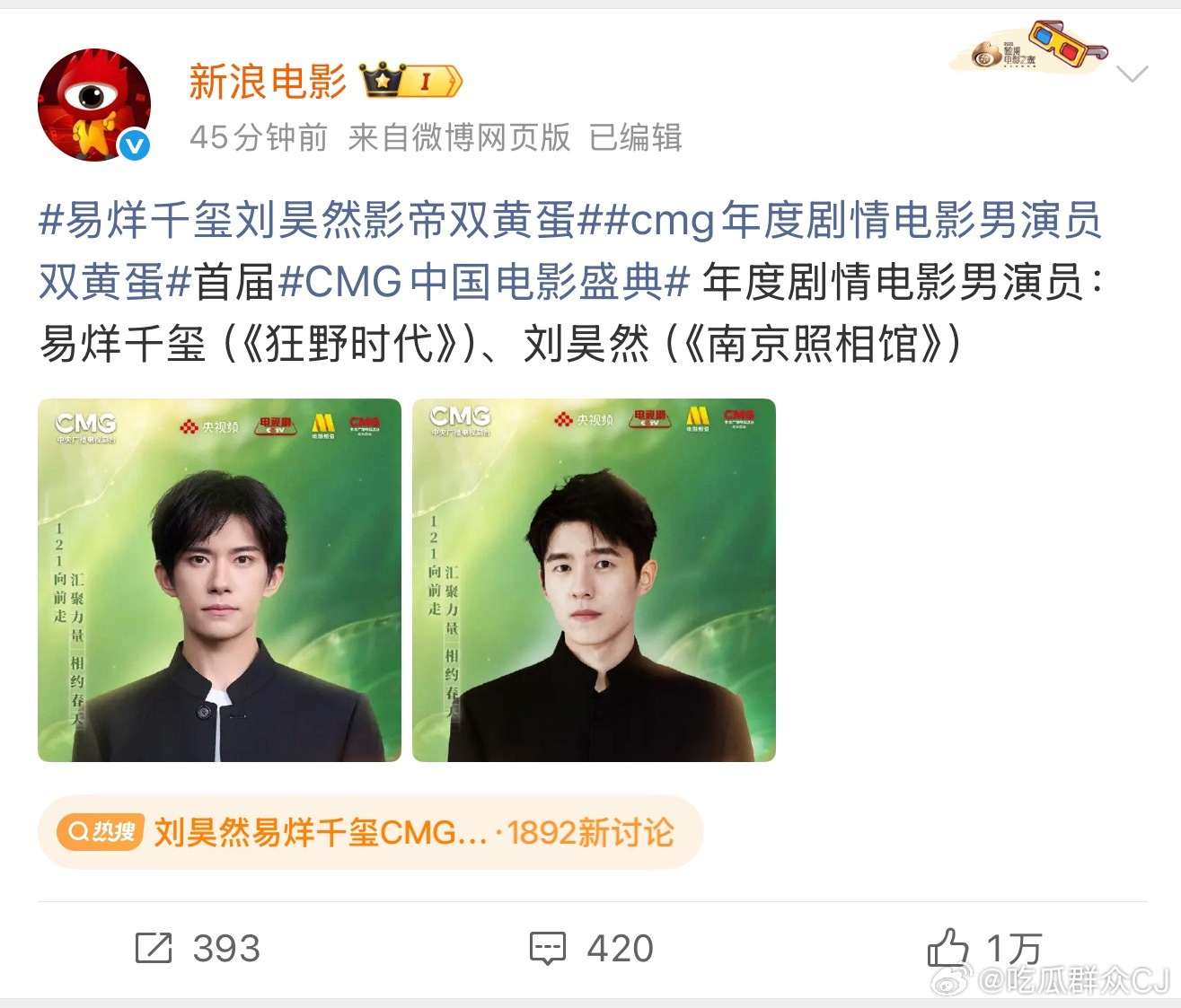 首届CMG中国电影盛典感觉是想做出中国版金球奖的效果,在肯定作品和表演时特意把类型细分,按照剧情/喜剧/动作三类分开做了提名,也就是说今晚怎么都要诞生三位影帝三位影后。结果剧情电影男女主都是双黄蛋,变成四帝四后,再加上年度导演也双黄蛋了,最后出来的效果就是中国电影的微博之夜or尖叫之夜,得奖人超多。