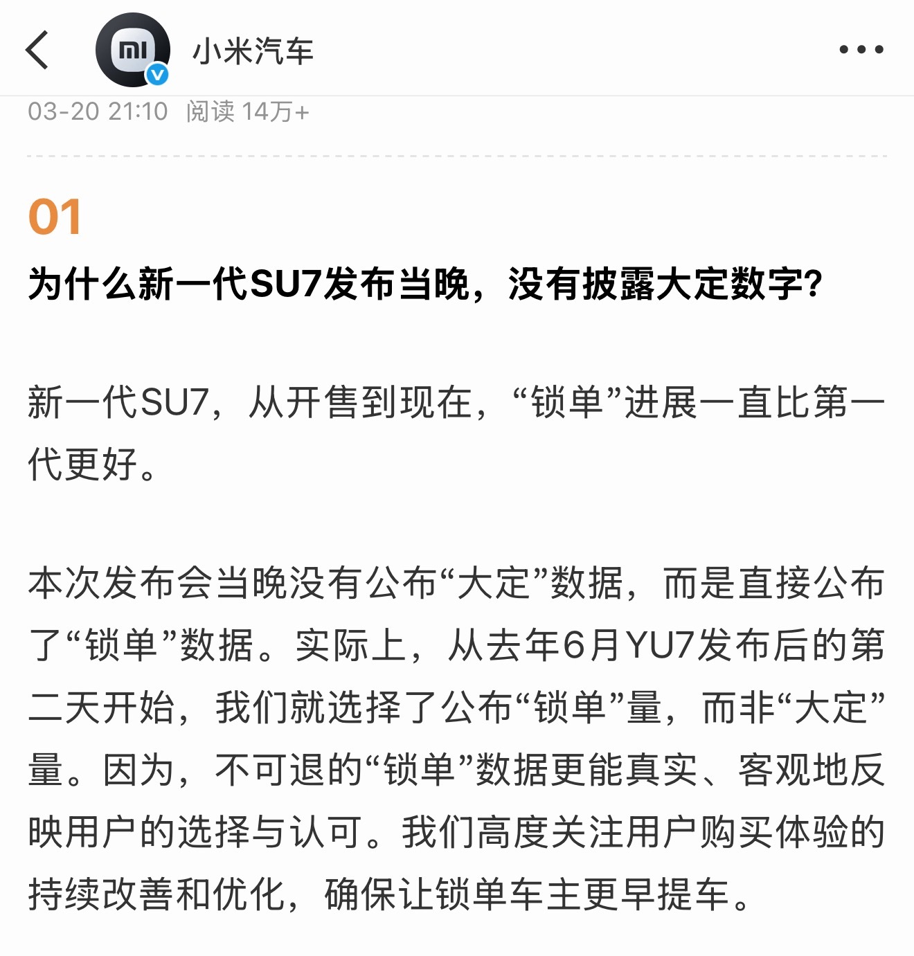 小米汽车回应为何不公布大定数字我觉得小米这次不公布“大定”反而更聪明,因为直接晒的是锁单。大定能退,水分一直都不小,锁单才是真正进排产、基本等于要买的人。新一代SU7 3分钟锁单1.5万,这个含金量其实比很多“几万大定”都高。
