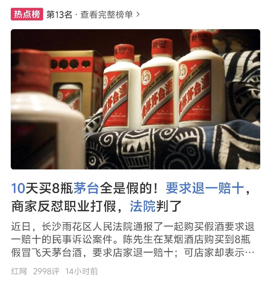 10天买8瓶茅台全是假的!要求退一赔十,商家反怼职业打假,结果法院只认2瓶?这账算得有点意思。 刚刷到长沙雨花区法院判的一个案子,看完就一个感觉:这年头,打假的和卖假酒的,都很会算账。 事情是这样的,有个陈先生,在一家烟酒店10天里买了8瓶飞天茅台。买完转头就举报到市监局,茅台公司一鉴定——全是假的。 按理说,卖假酒撞上较真的顾客,退一赔十没跑吧?陈先生也是这么想的,直接把店告了,要求赔十倍。 结果店家不干了,甩出一句:你是职业打假的! 店家这理由乍听像是耍赖,可法院还真听了。 法官说,10天买8瓶茅台,这量确实超出了一般人正常喝的范围。 而且在司法实践里,如果一年内起诉超过3件,就可能被认定是职业打假。 那最后法院怎么判的呢? 酒钱,8瓶全退。赔钱,只按2瓶的价赔十倍。 理由是:一个人正常喝,2瓶够了。剩下的6瓶,虽然你买了,但法院不支持按“消费者”的标准赔。 这事有意思的地方就在这。 以前大家总觉得,打假是好事,管你职不职业,只要假货是真的,就该重罚。 但这案子一出,风向好像变了——法院开始掐着“合理消费”这个尺子量了。 你不是普通消费者,就不给你全额赔。 店家卖假酒当然不对,但你要是冲着赚钱去,法院也不惯着。 我觉得这判决非常好。既没让卖假酒的占了便宜——钱全退了,还得按两瓶的价赔十倍,罚了将近5万块,肉疼;也没让“职业打假”钻了空子,想靠这个发家致富?没门儿。 但是我好奇一点,这“2瓶”的标准是怎么定的?是按酒量算,还是按家里几口人算? 大家怎么看?如果你是陈先生,你会服这个判决吗?