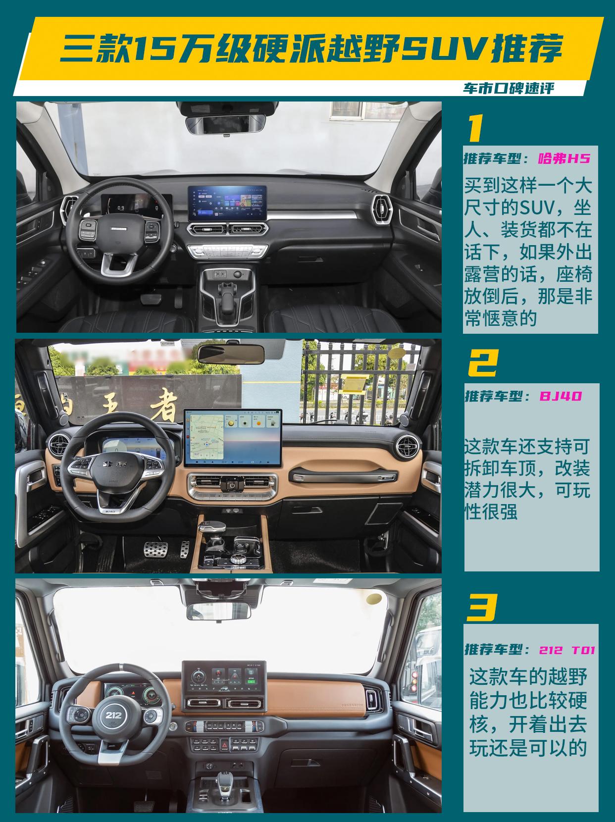 15万想买硬派越野,有哪些选择?给大家推荐一下哈弗H5、BJ40、212 T01这三款,他们都有“硬派”的标签,到底应该选哪一款呢? 1、先看看哈弗H5 现在的哈弗H5是一个5米多长的硬派SUV了,这款车的一个优势就是空间大,而且还是大5座。买到这样一个大尺寸的SUV,坐人、装货都不在话下,如果外出露营的话,座椅放倒后,那是非常惬意的。这款车的越野底子不错,据说是基于坦克平台打造。但是,现在这款车确实有点大了,如果在城里侧位停车啥的,似乎有点不太方便。 2、再说说BJ40 这是一个越野老炮了,方盒子的造型非常经典,开出去非常拉风。并且,这款车还支持可拆卸车顶,改装潜力很大,可玩性很强。15万左右能买到探险家版,动力足,通过性不错,整体的性价比非常高。 3、最后说212 T01 买这款车的多多少少是有点“致敬经典”,这款车以老212为宣传点,做了外观复古,能够唤起很多人的情怀。这款车的越野能力也比较硬核,开着出去玩还是可以的。但是有一说一,这款车还需要经历时间的验证。 三款车都是比较有特色的硬派越野车,如果你需要一个大空间的越野车,当工具车开,可以选哈弗H5;真去诗和远方的话,BJ40更合适一些;要情怀,纯玩儿的话,可以考虑212 T01。【来自懂车帝车友圈】