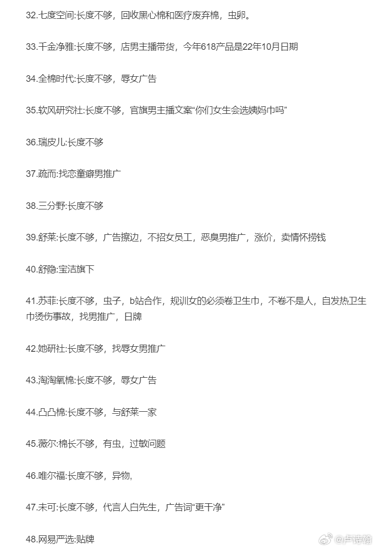 你说那换别的合作品牌,OK下面请看卫生巾辱女列表,你见过的,你没见过的,所有卫生巾品牌,都被指控过辱女对,请男代言人也算辱女