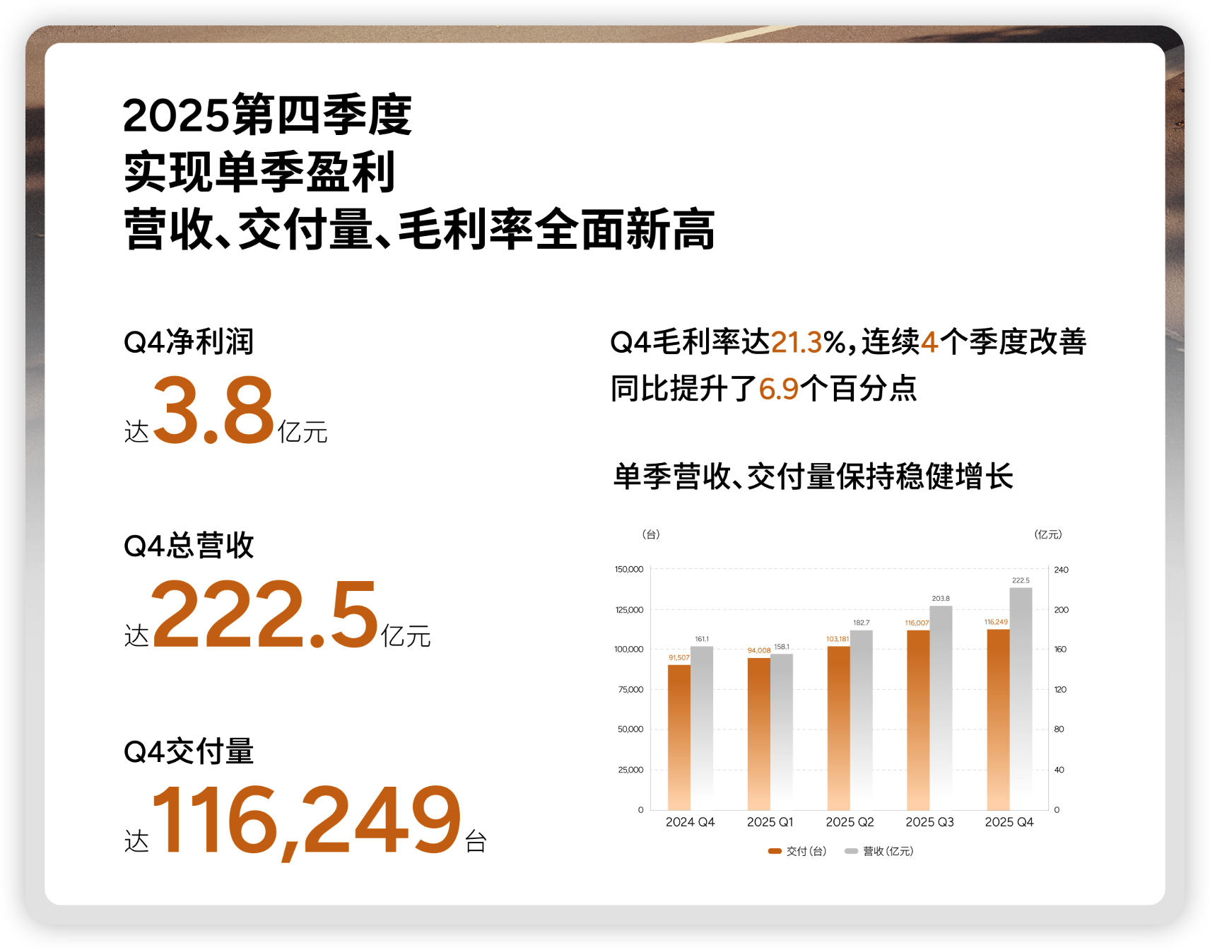 小鹏汽车 2025 第四季度首次盈利 3.8 亿,毛利率冲到 21.3% ,总算熬出头了。全年交付 42.9 万台,营收 767.2 亿,增速都挺猛。不过全年还是亏了 11.4 亿,一季度交付指引还环比下降,说明压力还在。
