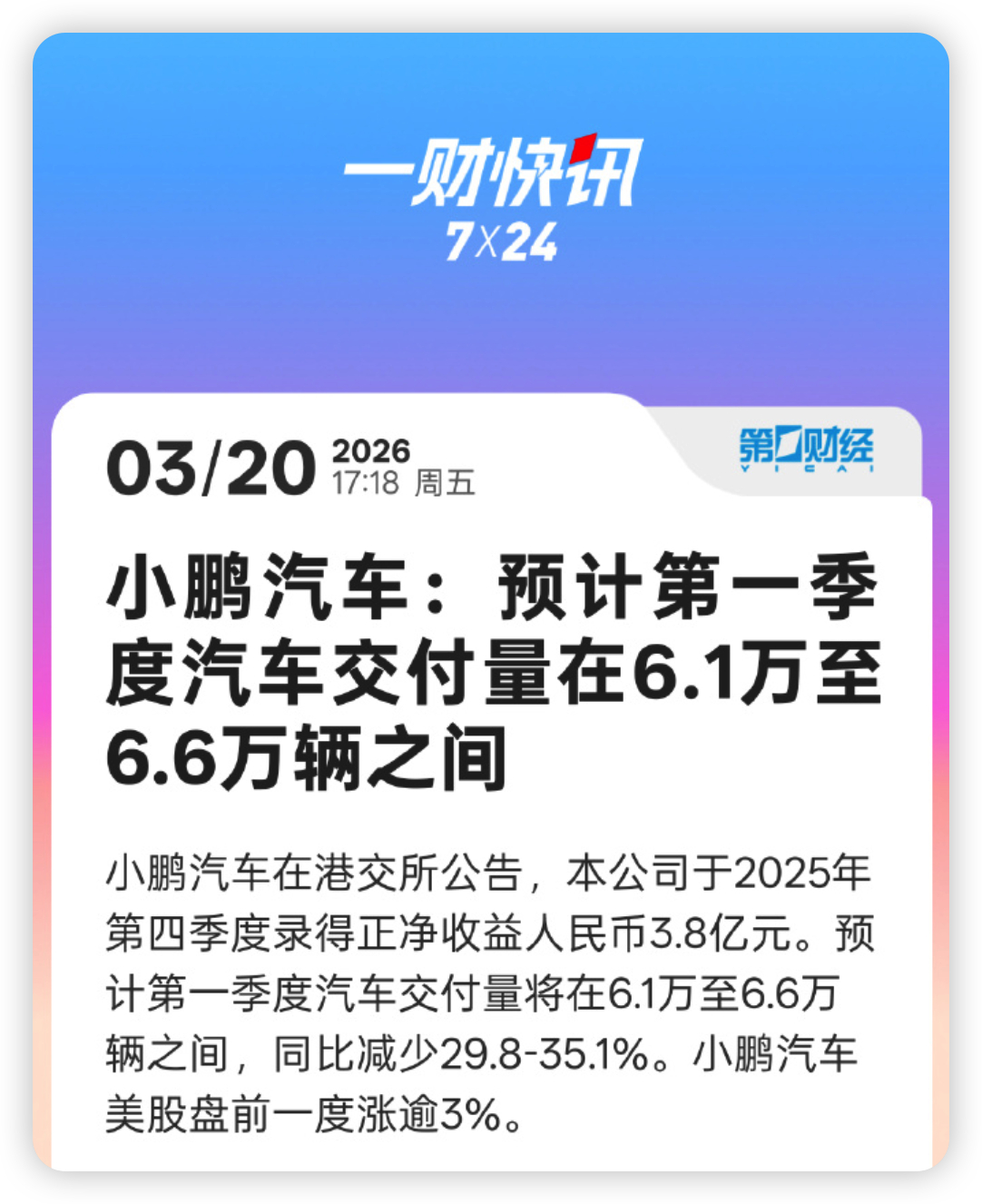 小鹏汽车 2025 第四季度首次盈利 3.8 亿,毛利率冲到 21.3% ,总算