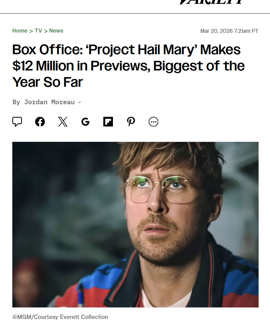 TNABO 科幻片《挽救计划》北美提前场收1200万美元,创下亚马逊/米高梅历史最好成绩,据业界预测将于周末三日取得7000万美元上下本土开画成绩,领先2015年《火星救援》(54M);或有望冲击另一部小说改编非续集片《奥本海默》的8000万美元开局