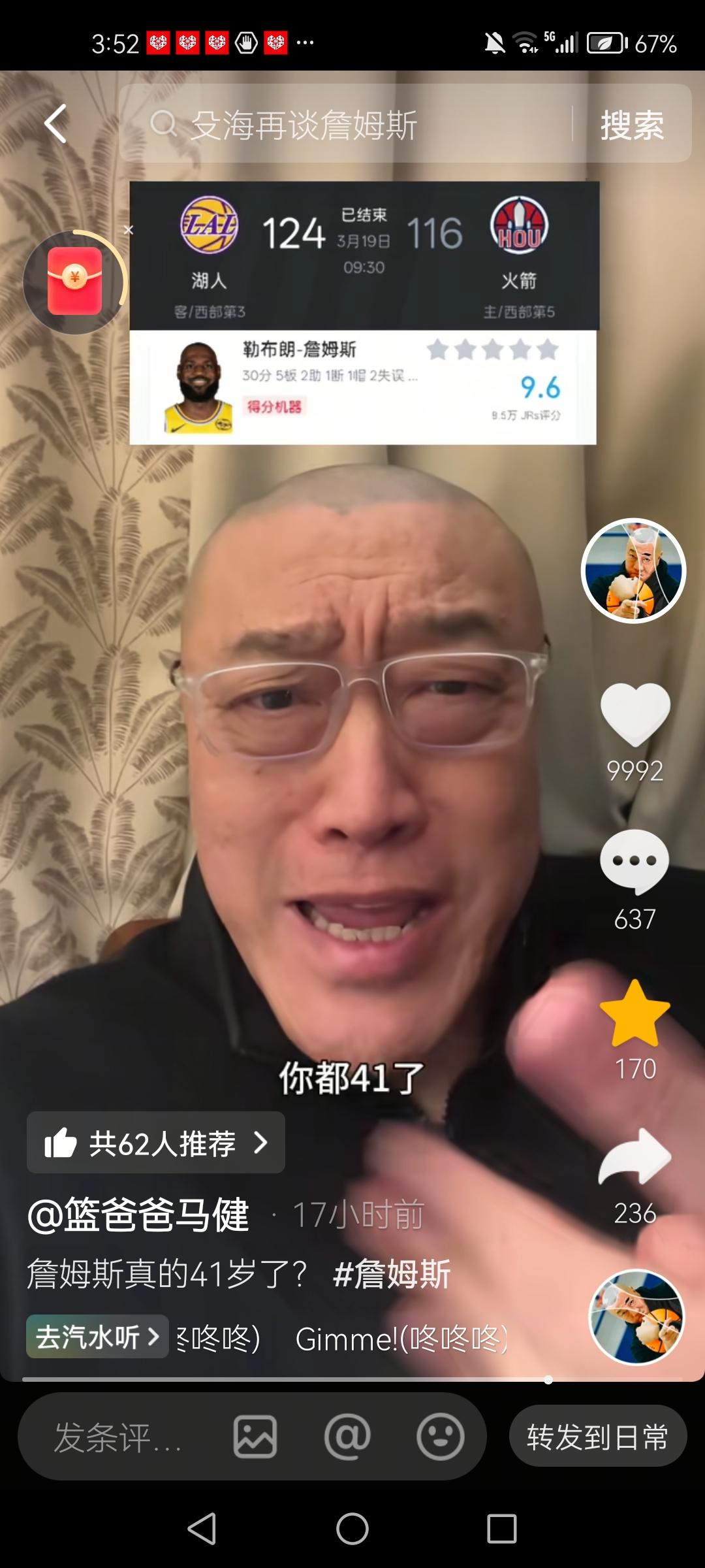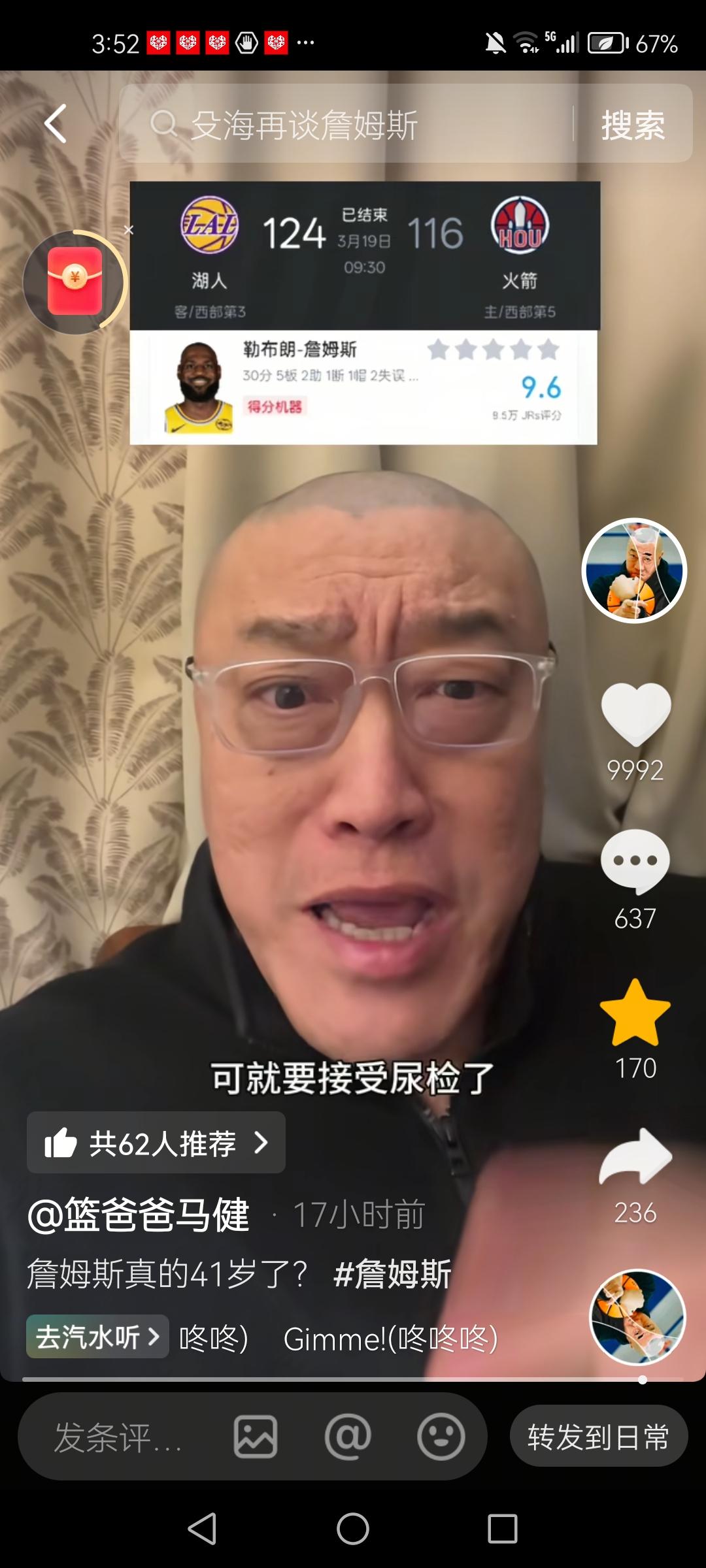 炸锅!詹姆斯又被质疑“嗑药”!41岁背靠背封神,马健都喊要尿检! 背靠背两战,詹姆斯彻底杀疯,全网直接炸锅! 对阵火箭:14投13中,狂砍30分,效率离谱到极致。 再战老东家热火:12投8中,19分15篮板10助攻,三双到手,再度刷新自己保持的最老三双纪录! 两场高效暴走,评论区直接失控: 有人质疑他年龄造假,有人喊他不是地球人,更有球迷直言:这状态不像是41岁,必须查药检! 就连著名评论员马健老师都看懵了,当场惊呼: 老同志,你真的是41岁了吗?再这么打,真得拉去尿检了!