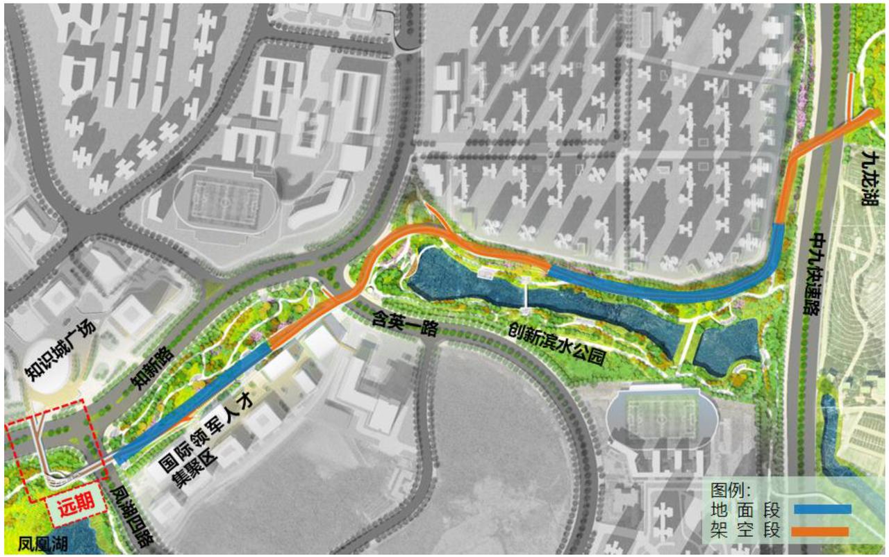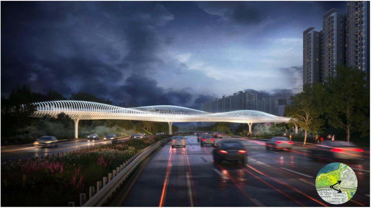 知识城凤凰湖-九龙湖云道效果图曝光,工期180天。 知识城凤凰湖-九龙湖云道项目位于广州市黄埔区中新广州知识城。 项目位于知识城凤凰湖与九龙湖之间,云道路线由南向北依次串联凤凰湖公园、创新滨水公园、九龙湖公园三大滨水节点,云道主线长度约1615米,其中桥梁段长约为858米,桥梁面积约4713平方米;道路长度757米,道路总面积 (含支线道路)约为5563平方米。园建工程建筑面积约为575平方米,并在已建碧道(现状2.46公里凤凰湖环线)周边增设相关标志 标牌等工作内容。 云道主要由光之翼云道及琴之弦人行桥组成,光之翼云道起点为凤湖四路,跨越含英一路到创新滨水公园,云道桥面人行道标准净宽为3.6m,全长约538.303m;琴之弦人行桥跨越中九快速路,并在九龙湖处设置坡道落地,标准人行道净宽为4.6m,其全长约275.05m。 主要建设内容包括:道路工程、桥梁工程、绿化工程、交通工程、给排水工程、电气工程等。 项目总投资9906万元,其中工程费用8367万元,工程建设其他费用1067万元,预备费472万元。项目所需建设资金由黄埔区财政安排解决。 最高投标限价:65,551,244.51元。 本项目施工总承包工期:180日历天,暂定开工日期2026年4月25日。 目前,知识城凤凰湖-九龙湖云道项目正在进行施工总承包公开招标。