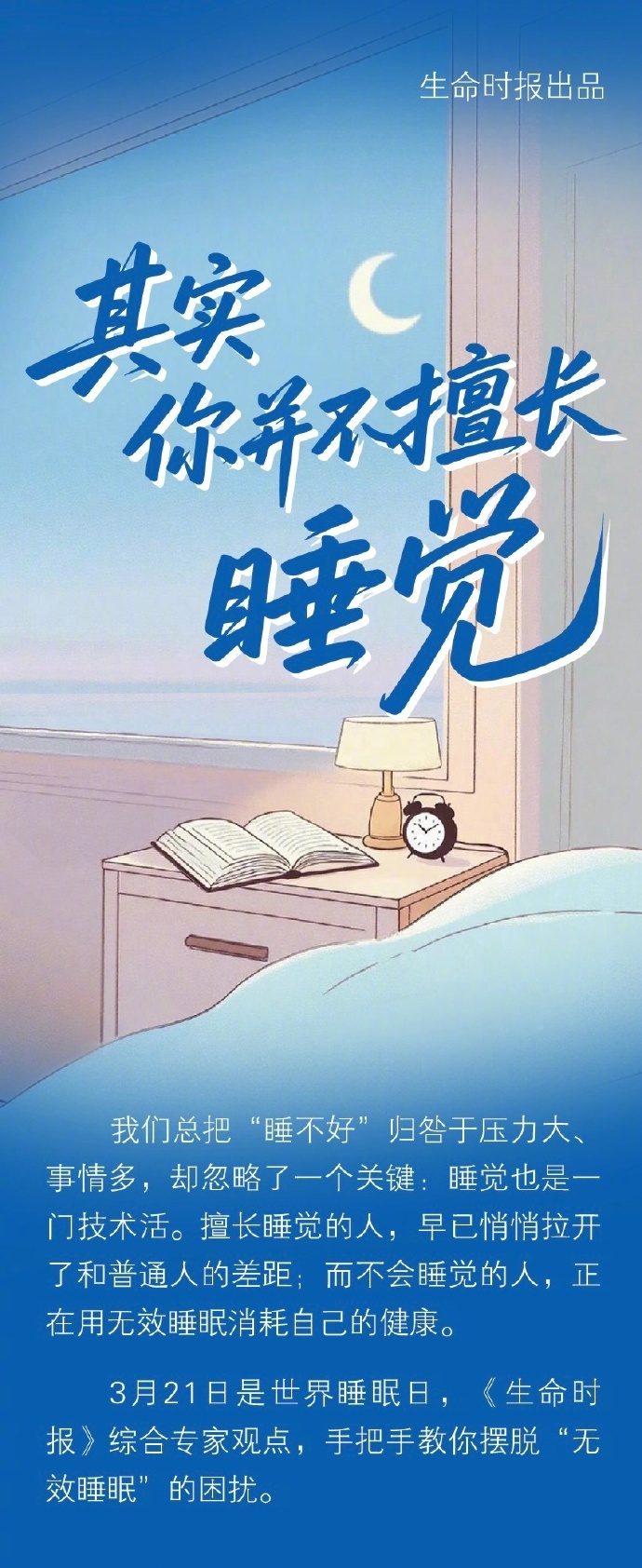 【一个扎心的事实:#其实你并不擅长睡觉#】#不会睡觉的人躺了一夜还在耗电# 我们总把“睡不好”归咎于压力大、事情多,却忽略了一个关键:睡觉也是门技术活。擅长睡觉的人,早已悄悄拉开了和普通人的差距;而不会睡觉的人,正在用无效睡眠消耗自己的健康。3月21日是#世界睡眠日# ,综合专家观点,手把手教你摆脱“无效睡眠”的困扰。网页链接