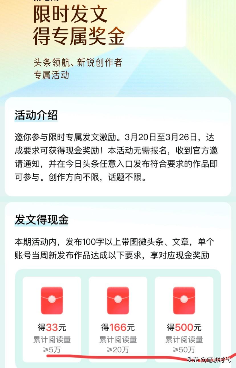 这几天,奖金收益经常砸我头上!昨天微头条小秘书又发来了通知,这对之前来说是小菜一碟,如今是难如登天! 领航新锐发文激励活动第7期开始了!3月20日-3月26日,达到阅读量要求即得现金,单人最高可得500元!不过累计阅读量要达到50万。 累计阅读量达到5万,可获得30元奖励,达到20万,可获得166元奖励。 我曾是很期盼这种奖励活动,如今我却懈怠了,匆匆看了一眼,心想:一周五万阅读量豆达不到,赚个30 元都这么难,500元奖励更是痴人所梦。 前几次这样的活动,500元也得过,166元可以说是轻轻松松。 这一次我不奢望了,这几天收益都靠活动奖金在维持,不然收益就是个位数。 看了昨天发的一篇文章只有几个阅读量,微头条只有1个阅读量。活动第一天就给我当头一棒。我哪有激情啊! 那个领航新锐节节高补贴活动奖励可叠加获得,达到三万阅读量获得30元,我都担心这周连这个活动收益奖励都难。 现在感到在头条能赚钱的毕竟是少部分人,大部人赚钱都很难。