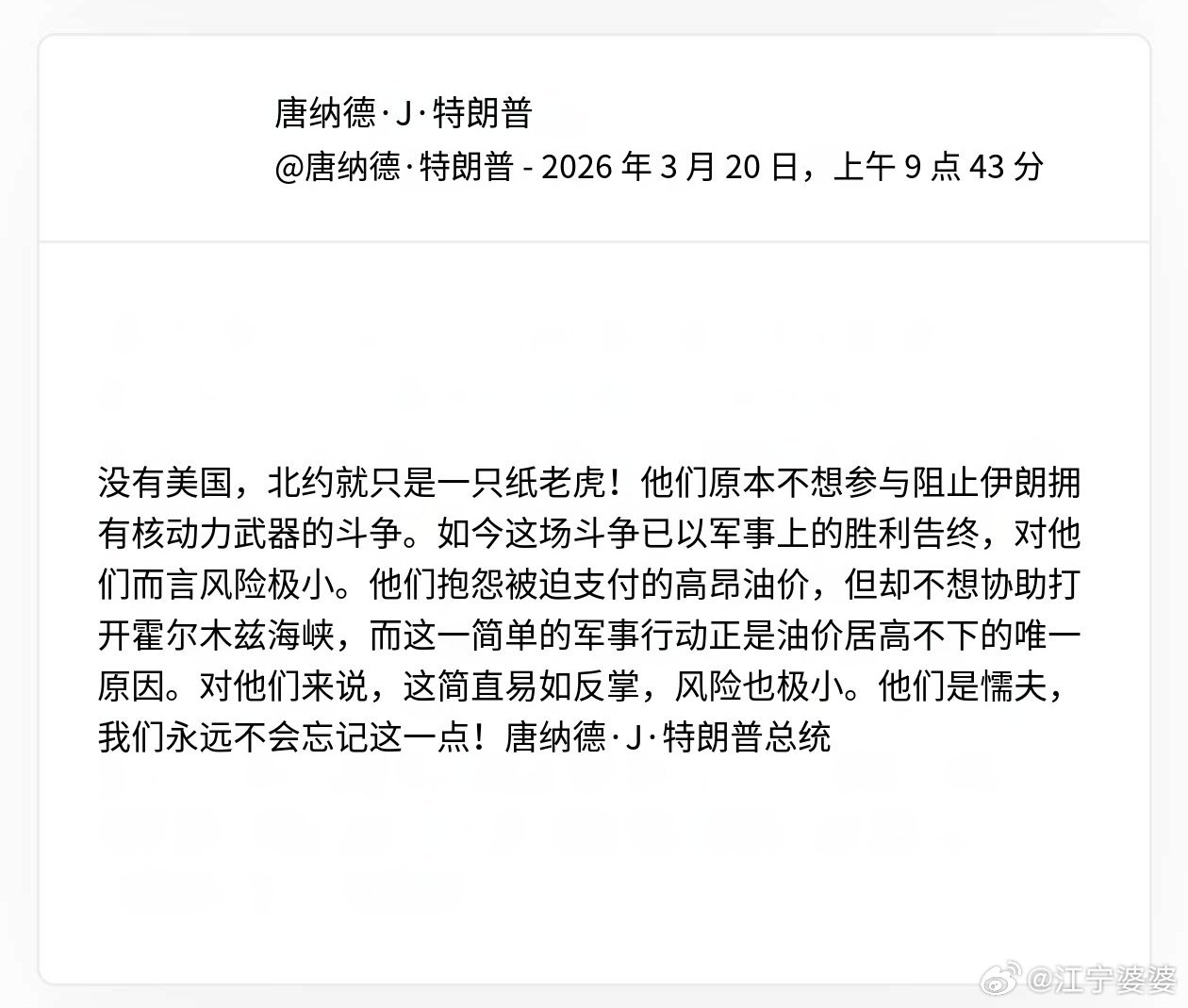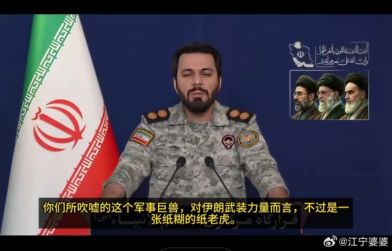 继川皇说伊朗是纸老虎后,伊朗革命卫队发言人也激情回应“美国才是纸老虎”,然后最搞笑的来了,川皇梅开二度,再再再次使用“纸老虎”,但骂的是没有出手帮他的北约: