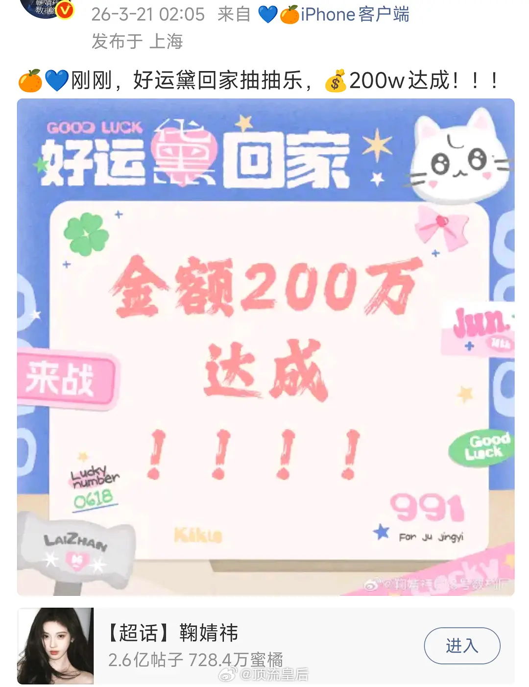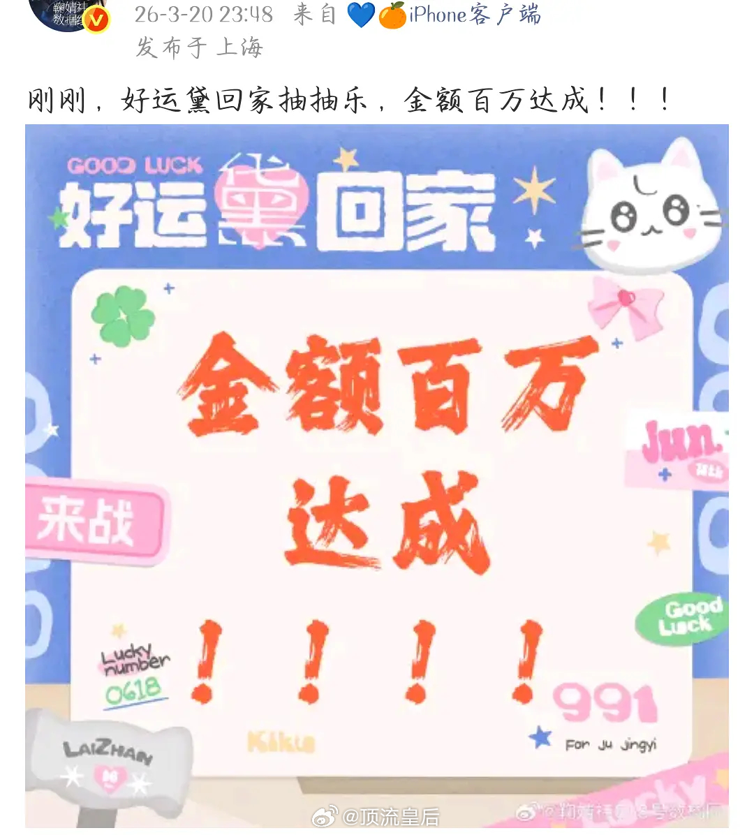 🍊丝昨天半夜又搞大事了,空降抽抽乐,一个小时不到 金额百万达成!到凌晨更是达到了150万,半夜破200万,太有实力了。