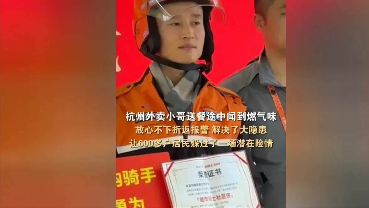 2月28日中午,杭州外卖员尹忠宇在送餐途中突然警觉到异常,他果断停下脚步。而正是他这一果断举动,最终保住了600多户居民的安全。   当时正值午间送餐高峰期,尹忠宇的电动车上挂着好几单待配送的订单,导航倒计时不停跳动,手机里的催单提示接连弹出。   途经中国针织城附近路段时,一股不同于餐饮油烟、生活垃圾的刺鼻气味扑面而来,那是一种类似臭鸡蛋的呛人味道,瞬间揪住了尹忠宇的神经。   早年餐饮行业的从业经历,让他对燃气专用加臭剂的味道格外敏感,这绝非寻常异味,而是地下天然气管道泄漏发出的危险信号。   没有丝毫犹豫,尹忠宇稳稳停靠好电动车,第一时间关闭电源,杜绝电路火花引发爆燃风险,彻底阻断了身边最直接的安全隐患。   多方询问后他得知,这股刺鼻异味从清晨就已经弥漫在空气中,只是过往路人大多匆匆路过,并未放在心上,更没人联想到燃气泄漏。   这片区域并非偏僻地段,而是覆盖凤凰城、赞成太和广场等多个小区,涉及647户居民和20家沿街商铺,人口密集、楼宇相连。   消防部门公开数据显示,天然气爆炸极限浓度为5%-15%,一旦泄漏气体在空气中达到这个区间,哪怕是静电、微小电火花,都能引发剧烈爆炸。   若是隐患持续拖延,后果不堪设想,群死群伤的悲剧随时可能上演,尹忠宇心里清楚,每多耽误一分钟,居民的危险就多一分。   他冷静掏出手机,清晰准确地向110指挥中心上报具体位置、异味强度和周边人员密集情况,为救援人员争取宝贵时间。   报警结束后,尹忠宇没有选择离开现场继续跑单,而是守在路口提醒过往群众禁止吸烟、远离明火,默默守护着现场安全,直到民警、消防员和燃气抢修人员悉数抵达。   看着专业人员接手处置险情,尹忠宇才松了口气,匆匆骑上电动车追赶延误的订单,这一趟停留,让他当天足足延误了3单配送。   得知事情原委后,外卖平台并未对他做出任何处罚,反而肯定了他的担当行为,这份包容,也是对凡人善举的最好回应。   杭州天然气公司的抢修记录显示,接警与处置的效率堪称神速,12时22分接到报警,12时46分就完成关阀止水,抢修人员连夜更换老化管道,3月1日清晨6点彻底消除隐患。   经专业核查,泄漏原因是地下燃气管道使用年限过久,管壁腐蚀破损,这类隐蔽性极强的隐患,日常巡检很难及时发现,全靠尹忠宇的细心警觉才得以排查。 3月10日,杭州上城区委社会工作部、区应急管理局等五部门联合举办表彰仪式,为尹忠宇送上锦旗、荣誉证书、现金奖励和应急礼包,外卖平台也将他纳入专属保障计划,给予长期权益扶持。   面对荣誉和夸赞,尹忠宇始终保持低调,没有丝毫张扬邀功,依旧每天穿梭在城市街巷,认真完成每一趟配送,路过事发路段时,还会下意识多留意周边的气味和环境。   在很多人奉行“事不关己高高挂起”的当下,不少人遇到异常都会选择视而不见,怕惹麻烦、怕耽误私利,将个人得失置于公共安全之上。   尹忠宇只是一个靠跑单支撑全家生计的普通打工人,没有任何人强制他必须停下脚步,可他却毅然舍弃个人利益,把陌生人的安危放在首位,这份担当显得格外珍贵。   我们总说英雄遥不可及,却忽略了英雄往往就在身边,他们没有惊天动地的壮举,没有耀眼的光环,只是在关键时刻,守住了心底的善良与责任。   外卖员尹忠宇燃气泄漏抢险的故事,看似是一次偶然的善举,实则是刻在骨子里的责任感使然,他用舍己为人的选择,诠释了平凡岗位的不凡担当。