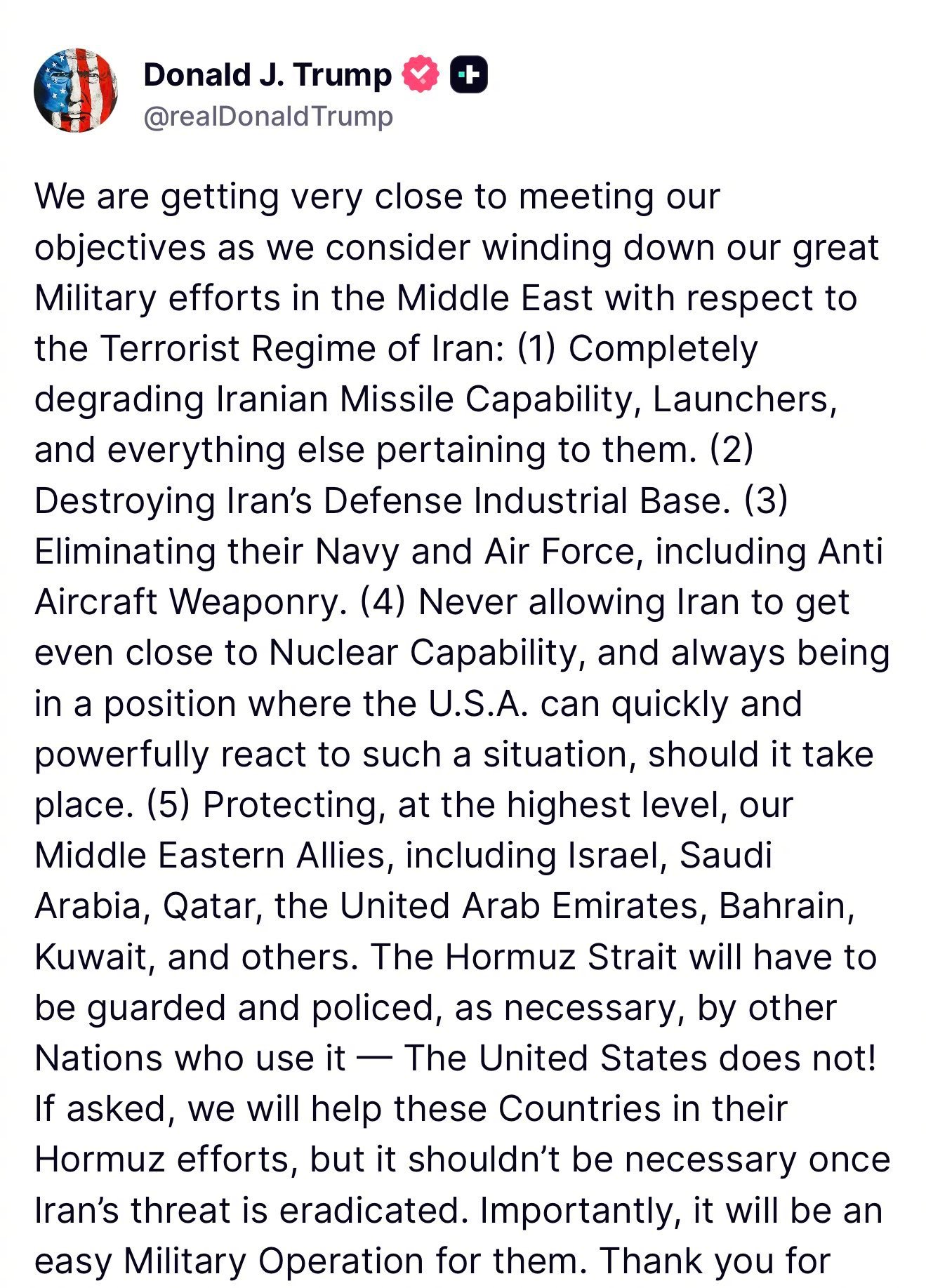 我们正在非常接近实现我们的目标,目前正考虑逐步结束我们在中东针对伊朗恐怖政权所进行的重大军事行动: