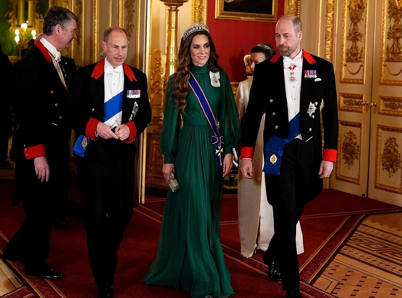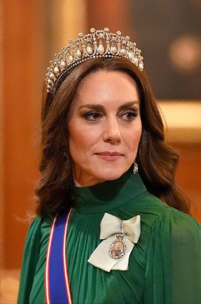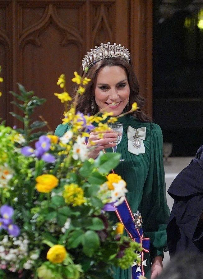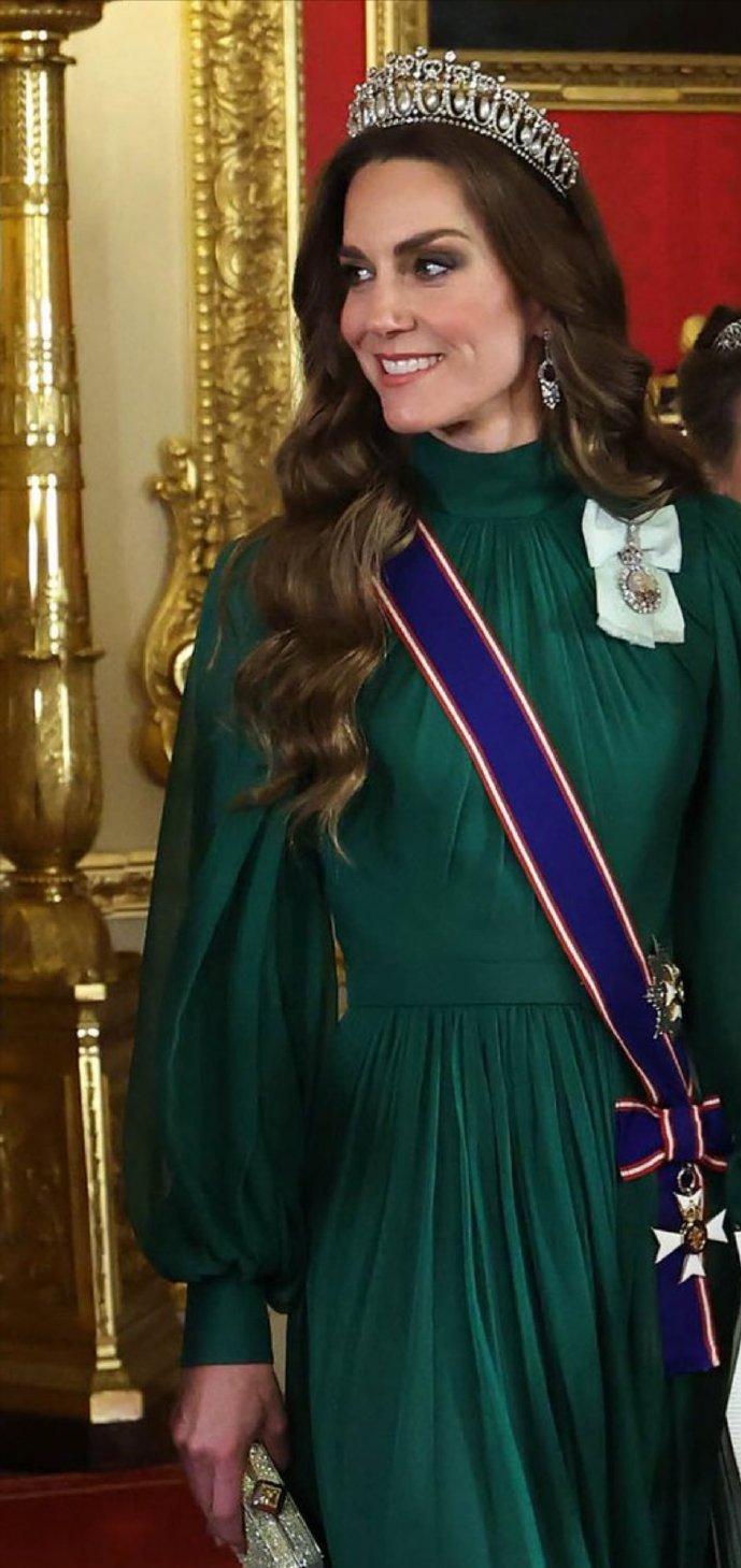 英王在温莎城堡隆重招待尼国总统夫妇[灵光一闪] 王室成员几乎倾巢出动,只是没看到苏菲, 国宴上凯特以绿色纱质长裙+珍珠泪王冠出席, 礼裙的高领和灯笼袖,强调保守遮盖不露肤, 对标尼国国旗色和服饰传统,交出完美答卷。[鼓掌]