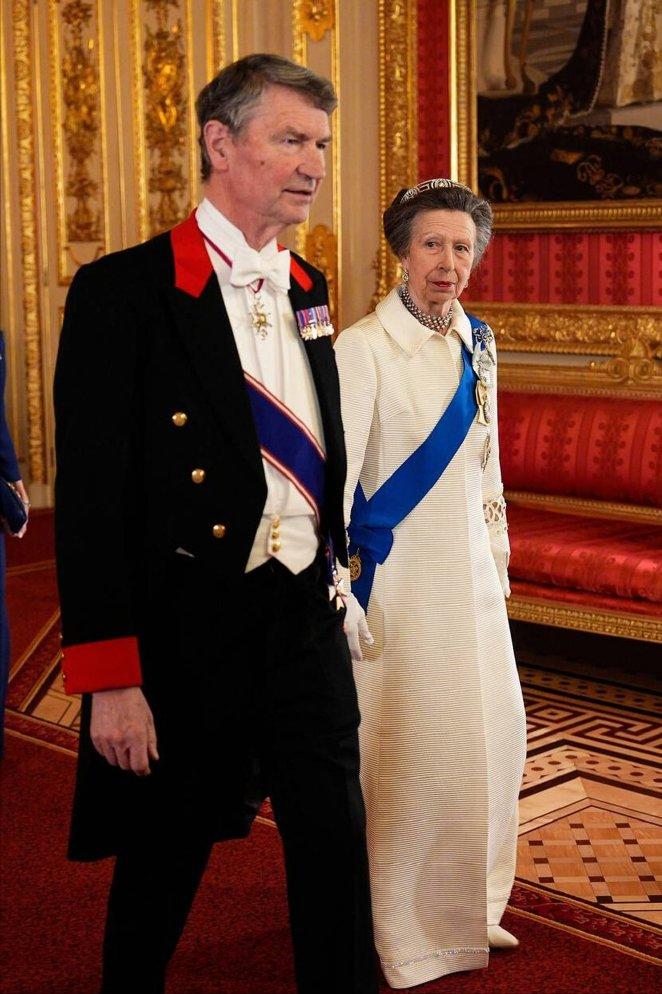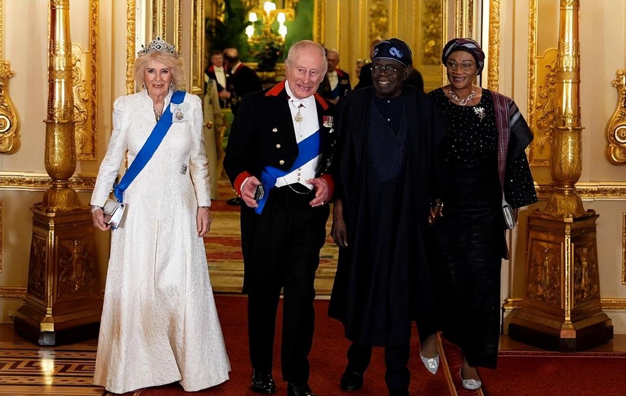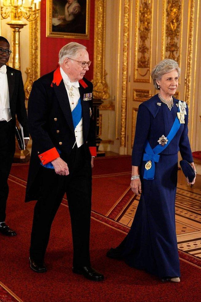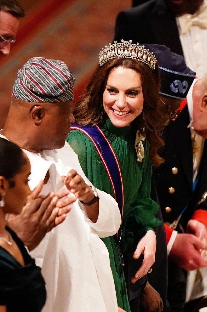 英王在温莎城堡隆重招待尼国总统夫妇[灵光一闪] 王室成员几乎倾巢出动,只是没看到苏菲, 国宴上凯特以绿色纱质长裙+珍珠泪王冠出席, 礼裙的高领和灯笼袖,强调保守遮盖不露肤, 对标尼国国旗色和服饰传统,交出完美答卷。[鼓掌]
