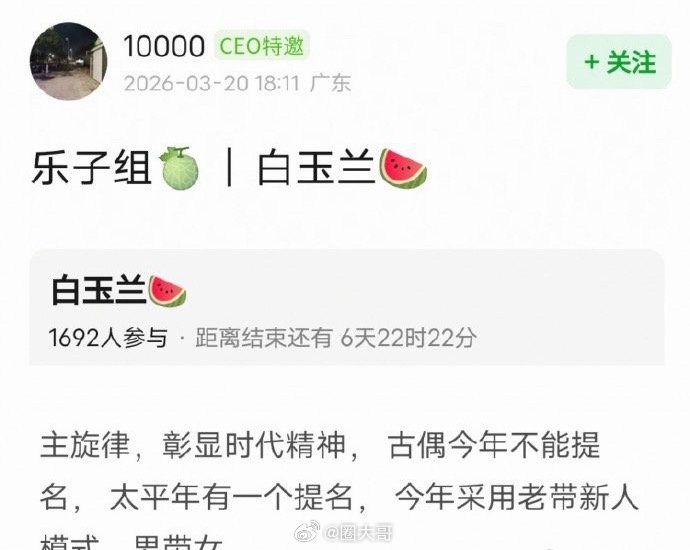曝2026白玉兰视后要给新人2026白玉兰刚预热,就有新料来了,感觉今年的白玉兰会有黑马出现啊,古偶剧无缘今年的白玉兰,视后要给新人,目前呼声最高的女演员是杨紫和杨幂,这么一看杨紫的事业运也太牛了叭!曝古偶无缘今年的白玉兰