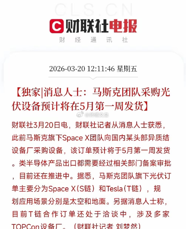 核心利好消息3 月 20 日消息,马斯克旗下 SpaceX 团队向国内头部异质结设备厂采购光伏设备,预计 5 月第一周发货,出口备案审批推进中;订单分 SpaceX(太空场景)与 Tesla(地面场景)两条链,Tesla 链正与多家 TOPCon 设备厂洽谈。此举验证国内光伏设备全球竞争力,打开高端应用场景,推动板块景气度提升。