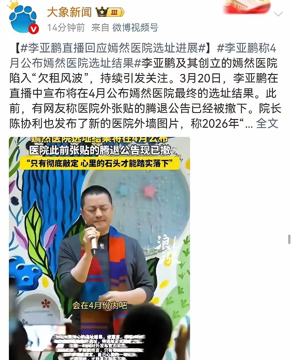 李亚鹏,心里石头还未落地! 3月20日晚上,李亚鹏连夜冲上了热搜,原因是在直播时,他宣布了一个重磅消息——嫣然医院的最终选址结果,四月就会公布!这消息一出来,不少关注“欠租风波”的网友都松了口气。 早在2022年,嫣然医院就因租金问题陷入纠纷、原年租五百万的场地,租约到期后涨到一千一百万,再加上疫情影响,累计欠款超两千六百万,被法院判决腾退。 后来院外地腾退公告被撤下,院长晒出医院外墙地科室海报,口腔科、中医科等仍在对外宣传,暗示医院运营并未完全停滞,这让关注地网友稍稍松口气! 目前医院的医保定点资格,只到2025年底,2024年得年检结果,也没在民政平台公示,后续运营还有不少未知数,李亚鹏为撑住医院,个人垫付部分租金,还承担着无限连带责任。 他曾在直播里坦言,就算付出一切,亦要给唇腭裂孩子完成手术、这些年医院做大量免费手术,财务记录相对透明,但租金压力始终如影随形,让公益之路走得格外艰难。 有网友疑惑,为啥突然四月揭晓、之前不是说要拖到啥时候来着,其实这种疑问不难理解,毕竟风波拖许久,突然给出明确时间,难免让人好奇背后地考量,从欠租纠纷到腾退反转,嫣然医院的每一步都牵动着关注公益的人,只是四月得选址真能解决所有问题吗、在我看来,李亚鹏这一路全靠情怀撑着,抱着救助孩子的初心,却被现实地运营成本绊得够呛,希望这次选址能给医院找个安稳的家,让公益地火苗一直燃下去! 这事你怎么看?